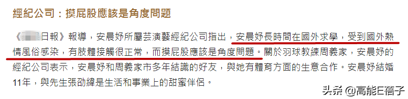 對此,安晨妤的經紀公司回應,他們只是長期受到國外熱情文化影響,有肢體接觸很正常,而摸屁股只是角度問題。老公也表示相信妻子。