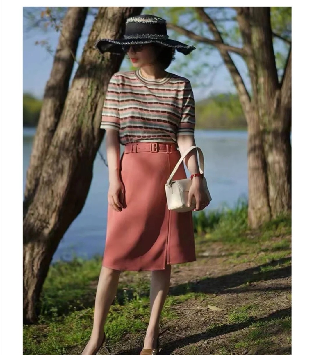 這款條紋衫中夾雜的顏色很豐富,但因為條紋的形成看起來分外的整齊,也能讓這款服裝在保留特色和辨識度的同時,不會讓外形的繁雜感得到提升。這位女士搭配一款包臀裙,又能透露纖細的小腿曲線。對這款穿搭感興趣,照著穿衣,一定能形成個人的穿衣風格。