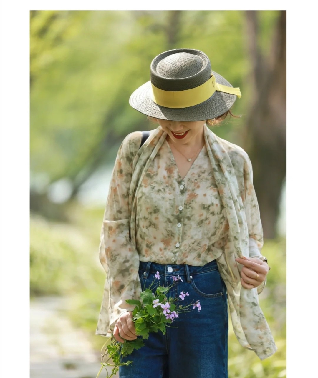 像這件充滿了清新氣氛的碎花襯衫,它就是很有特色的服裝之一,它的整個色調選用不會太明亮,而且主色調的運用很高級,也讓這款服裝看起來醒目。在搭配時,可以借用牛仔裙或者是牛仔褲闊腿褲相配,只要是那些外形設計簡約一點的下裝,都可以與這類上衣構造出繁與簡的搭配模式。