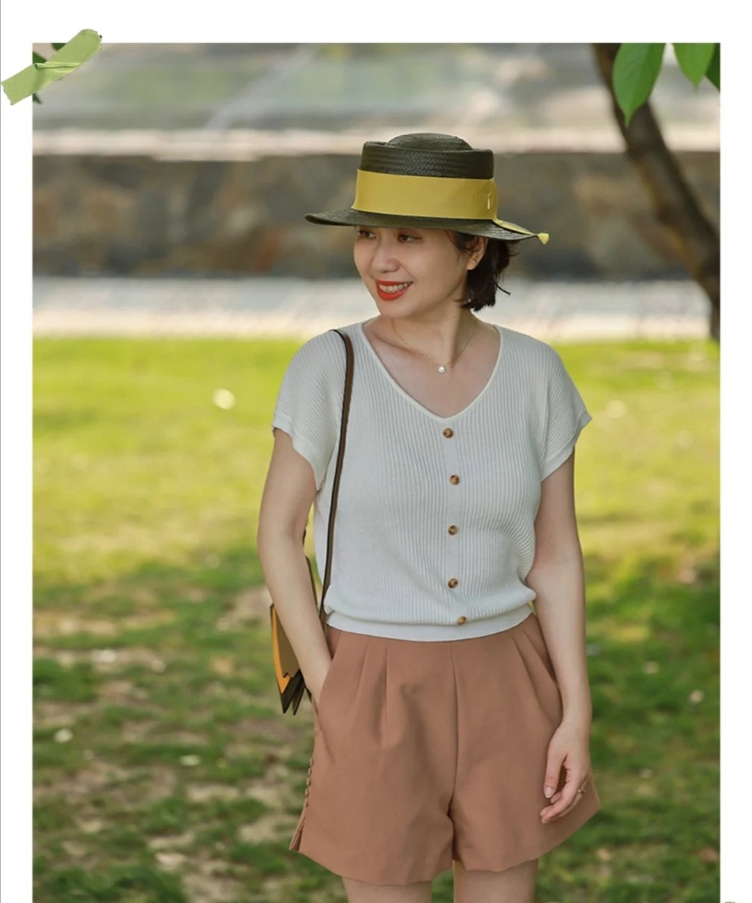 這件純白色的針織短袖,它的材質毫無疑問是能讓人感受到非常舒適的類型,乾淨的顏色,在夏日使用也不會造成視覺的悶熱。露出來的頸部肌膚恰當,更加輕盈。