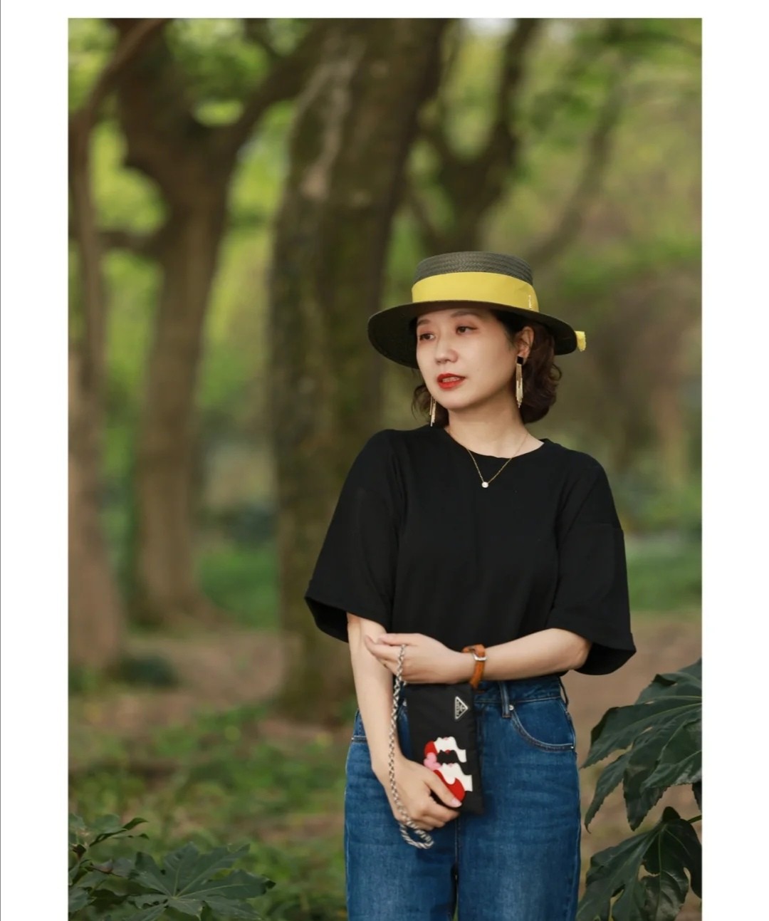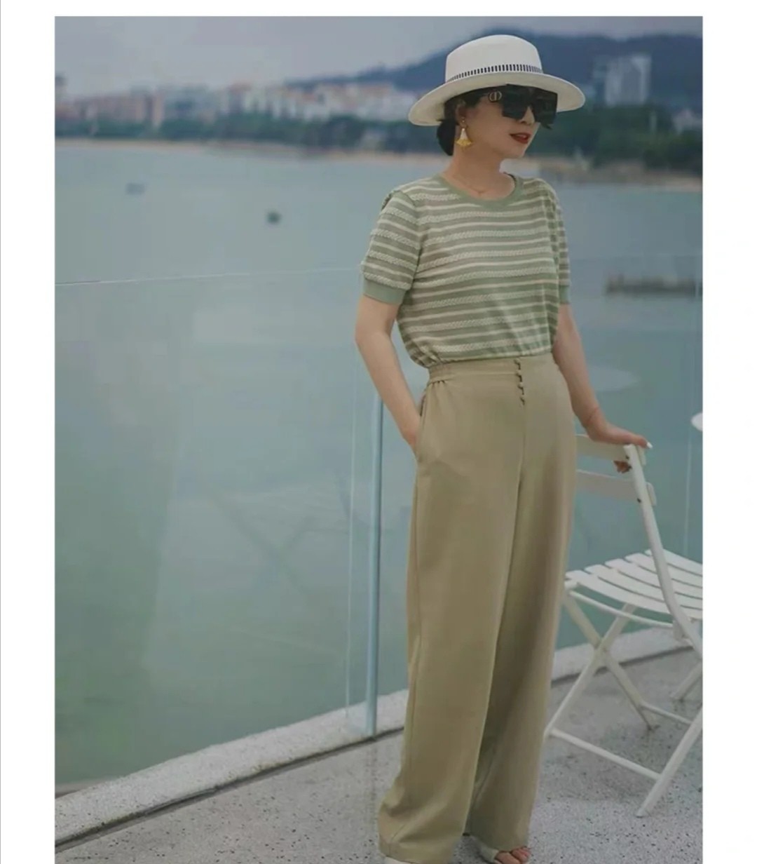 例如這件條紋上衣,它就是清新活力的代名詞,綠色和白色之間的拼接相當完美,也能借助綠色形成明顯的減齡效果和輕微的活潑氣氛。如果小腿不夠纖細,不要嘗試太短的裙裝,可以利用寬大一點的闊腿長褲,塑造舒適的著裝。