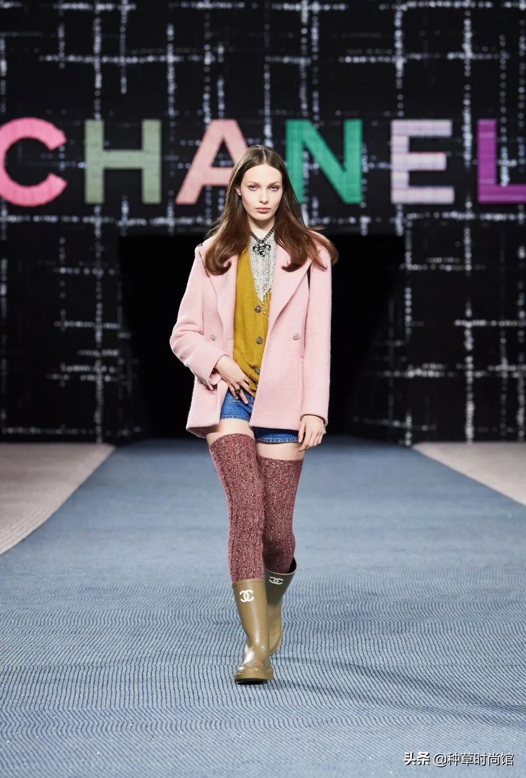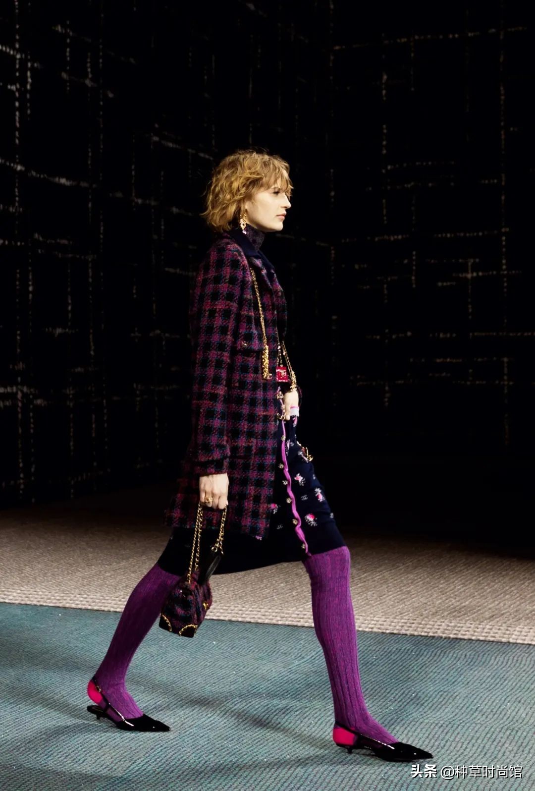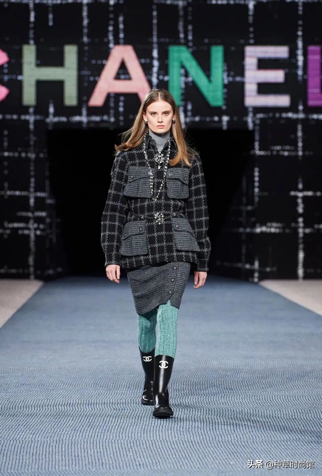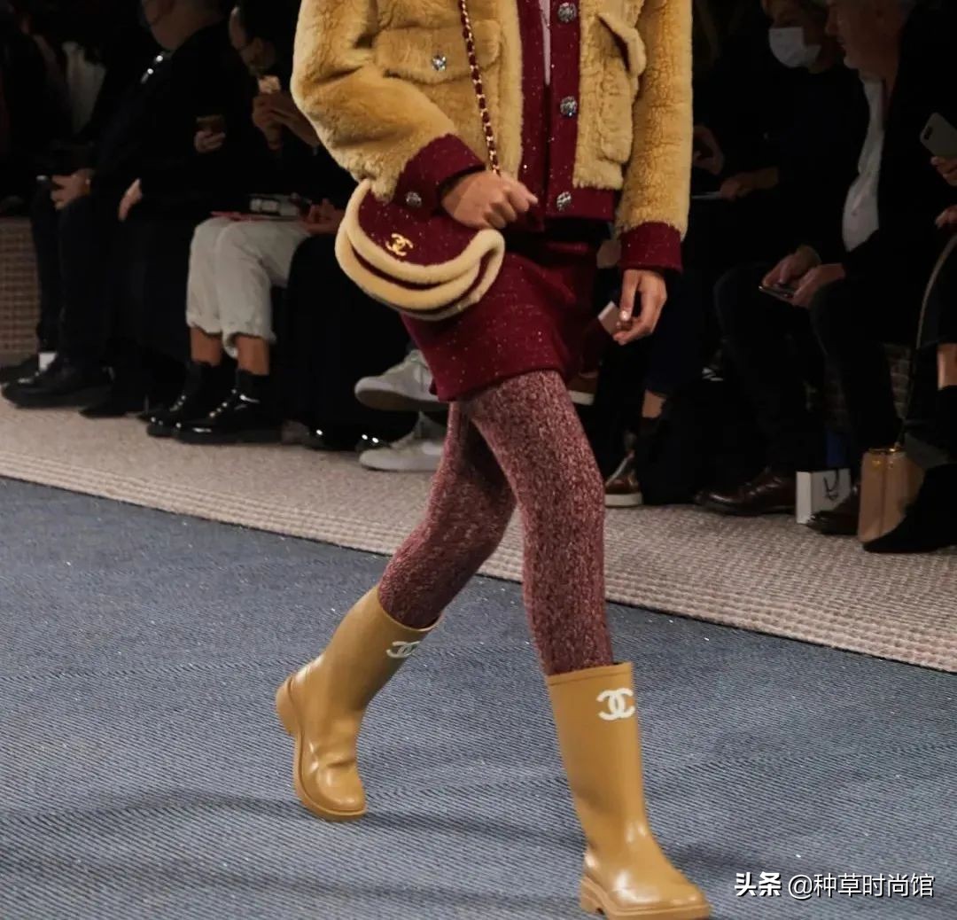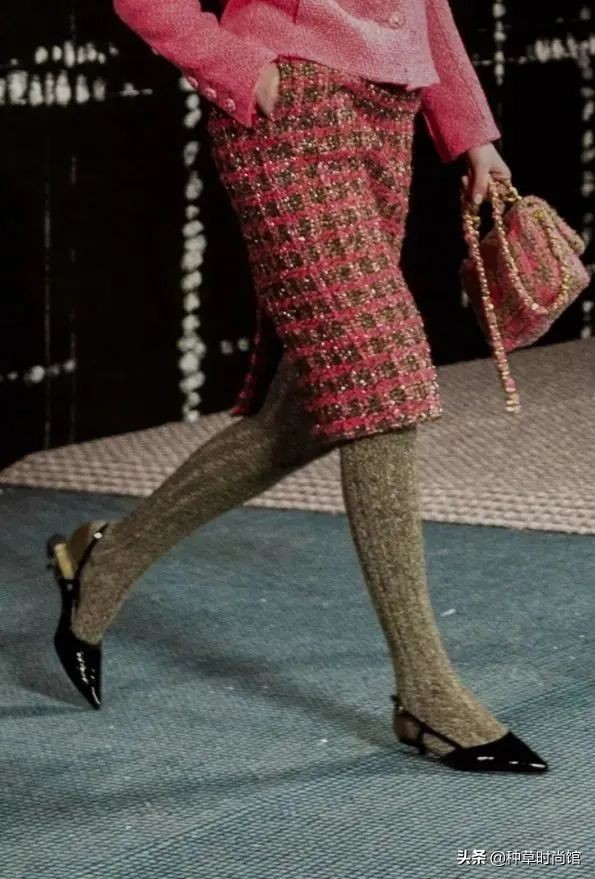 Channel這次給出的答案是:不!即使在秋冬,女性也可以把精緻和舒適同時擁有,所以在這次大秀上,我們能看到幾乎每款成衣都搭配了針織高筒襪。