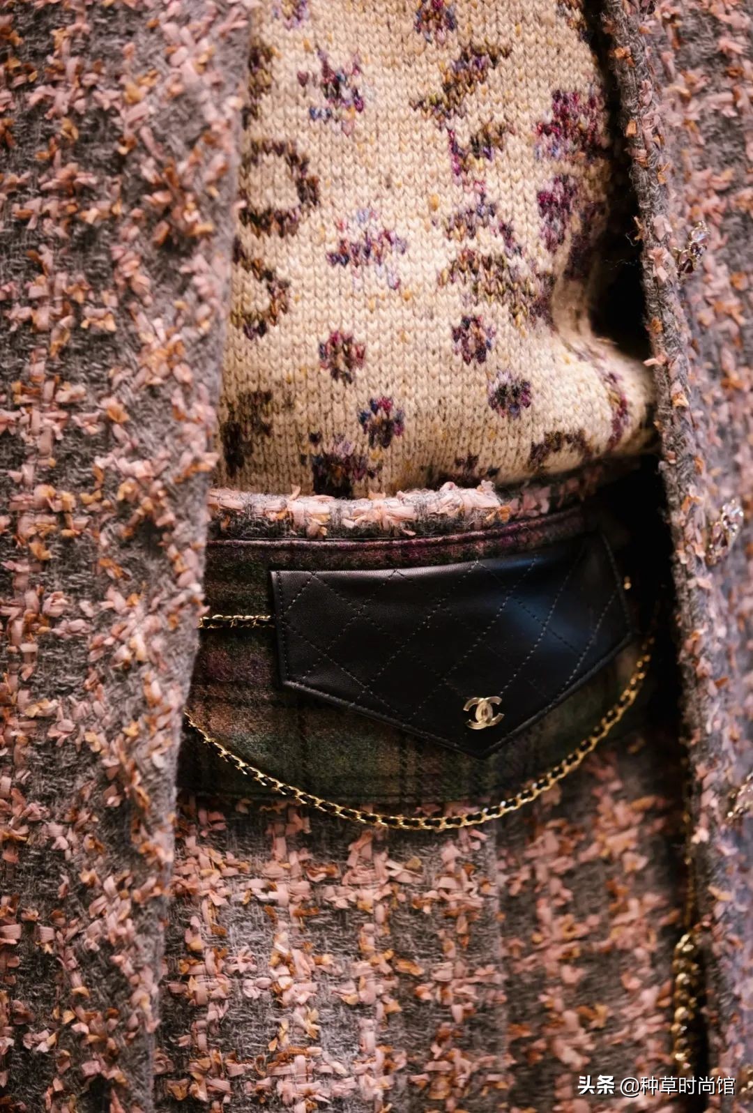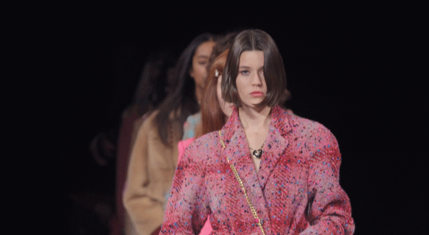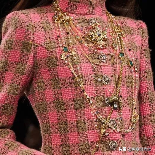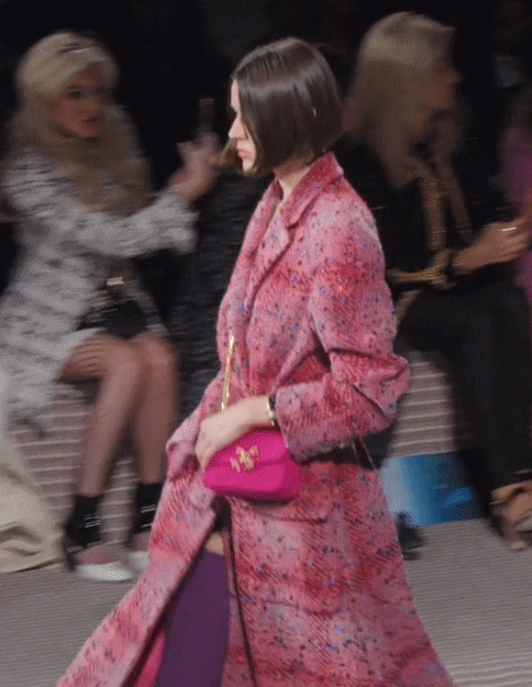 再說回粉色,其實這次秀的成衣很有小細節,因為靈感是特威德河的景色,所以設計成這種冷暖交替、明暗交接的斜紋軟呢真的很高級!