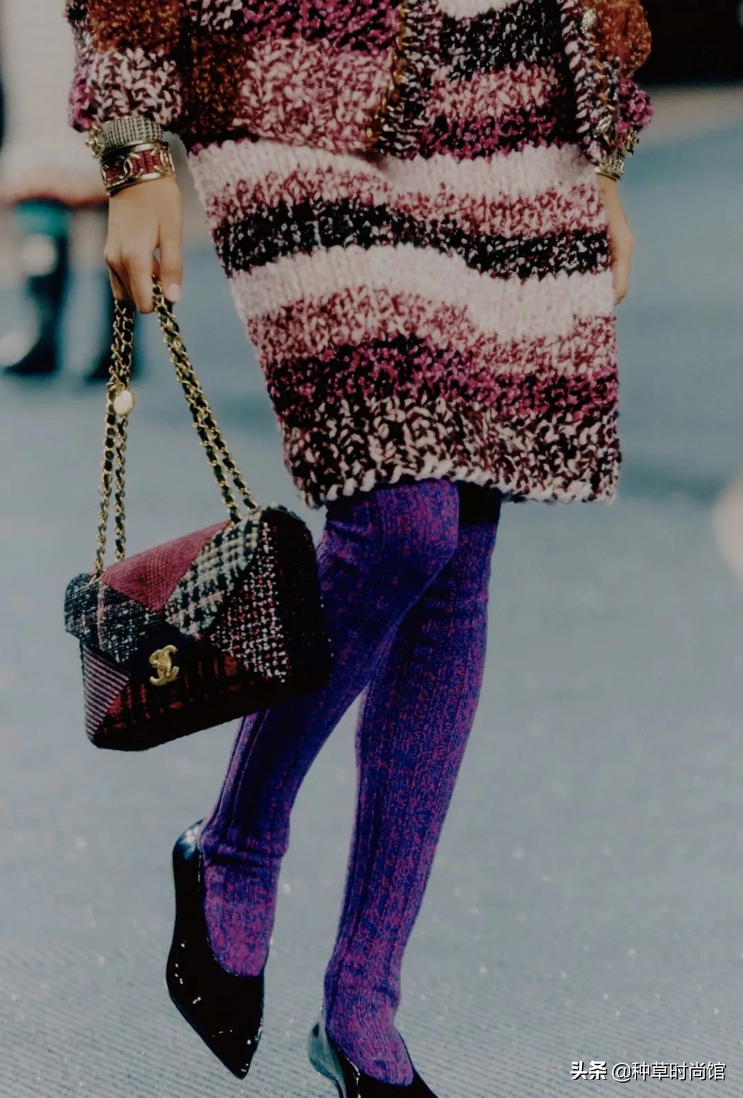 隨著搖曳的身姿,大家也注意到了下半身搭配的紫羅蘭色針織襪,讓整體搭配色調統一,卻有別樣層次~