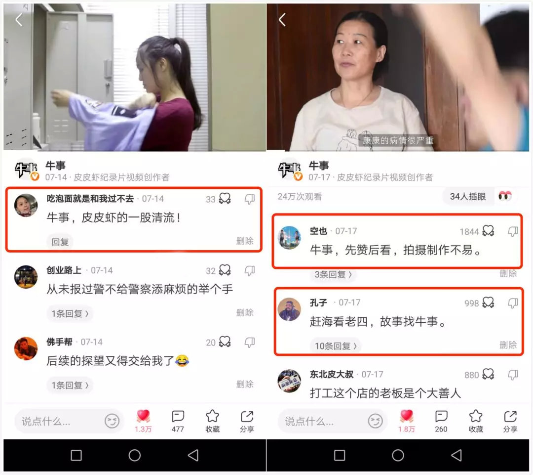 在創辦人物紀實短視訊「牛事」之前,孫叢偉是個重疾理賠審核員。除了醫生和護士,他可能是和大病面前的人情冷暖接觸最多的那批人。 從那時起,他就癡迷於收藏整理工作中遭遇的故事。這也成了他創辦「牛事」的第一座內容富礦。 「牛事」的名字取自「News」,但對準的是那些看起來沒有什麼「新聞點」的普通人:改行賣炸雞的打手、一天工作10小時的老奶奶、60歲仍然當學徒的工人…… 它們算不上精緻,但是每條視訊背後,都蘊含著一個或一群普通人的辛酸。這也引起了許多觀眾的共識,特別是一些交互性更強的短內容社區——在皮皮蝦App上,甚至有觀眾想要給還在民居辦公的「牛事」拉一筆投資。 相比朋友圈和微博,內容互動社區離用戶的熟人圈子更遠,離興趣和同好更近。 不論「牛事」這樣的創作者還是普通的UGC用戶,都樂於在這裡進行創作和傳播。