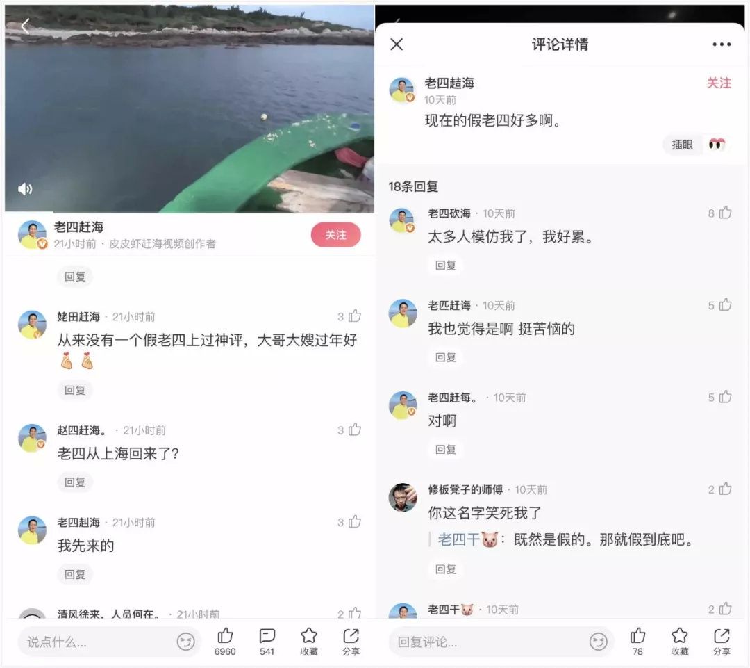 創始人孫叢偉口中的「人格化」,指的是用戶將「牛事」當成一個講故事的人看待了。用戶喜歡看他們拍的人物紀實短視訊,也關心「牛事」的發展和生計。 在皮皮蝦App中,像牛事這樣被粉絲追捧的還有「老四趕海」。這個每次都能從海邊泥沙裡挖出魚蝦螃蟹的漁民,給觀眾帶來關於浪漫、豐收和田園詩意生活全部想像。 他甚至被封為「趕海四大天王」,每次發新視訊,都有觀眾留下評論——「精神支柱終於更新了」「這是我唯一全屏看的視訊」。