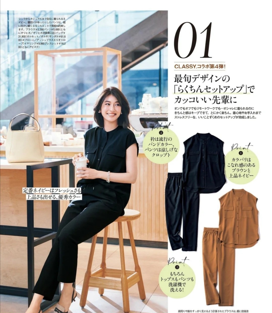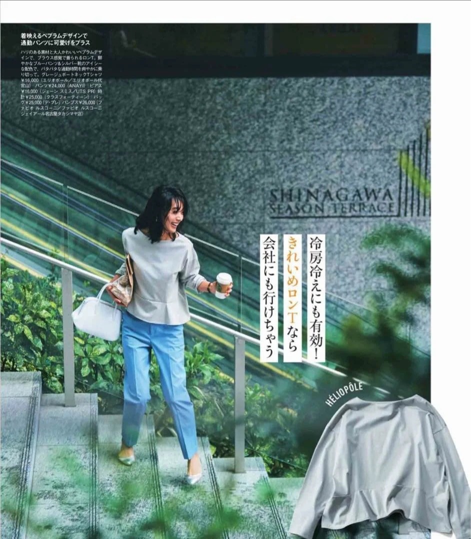 若是暫時還不信任其它的色系,不如就以黑色為主,這種色彩永遠不會演繹出違和感,也最容易與不同年齡的女性相處和諧。上衣和褲裝都運用了黑色之時,一定要注意透露出膚色。像這件上衣,它就會讓大半部分的手臂肌膚展現出來,減少沉重感。