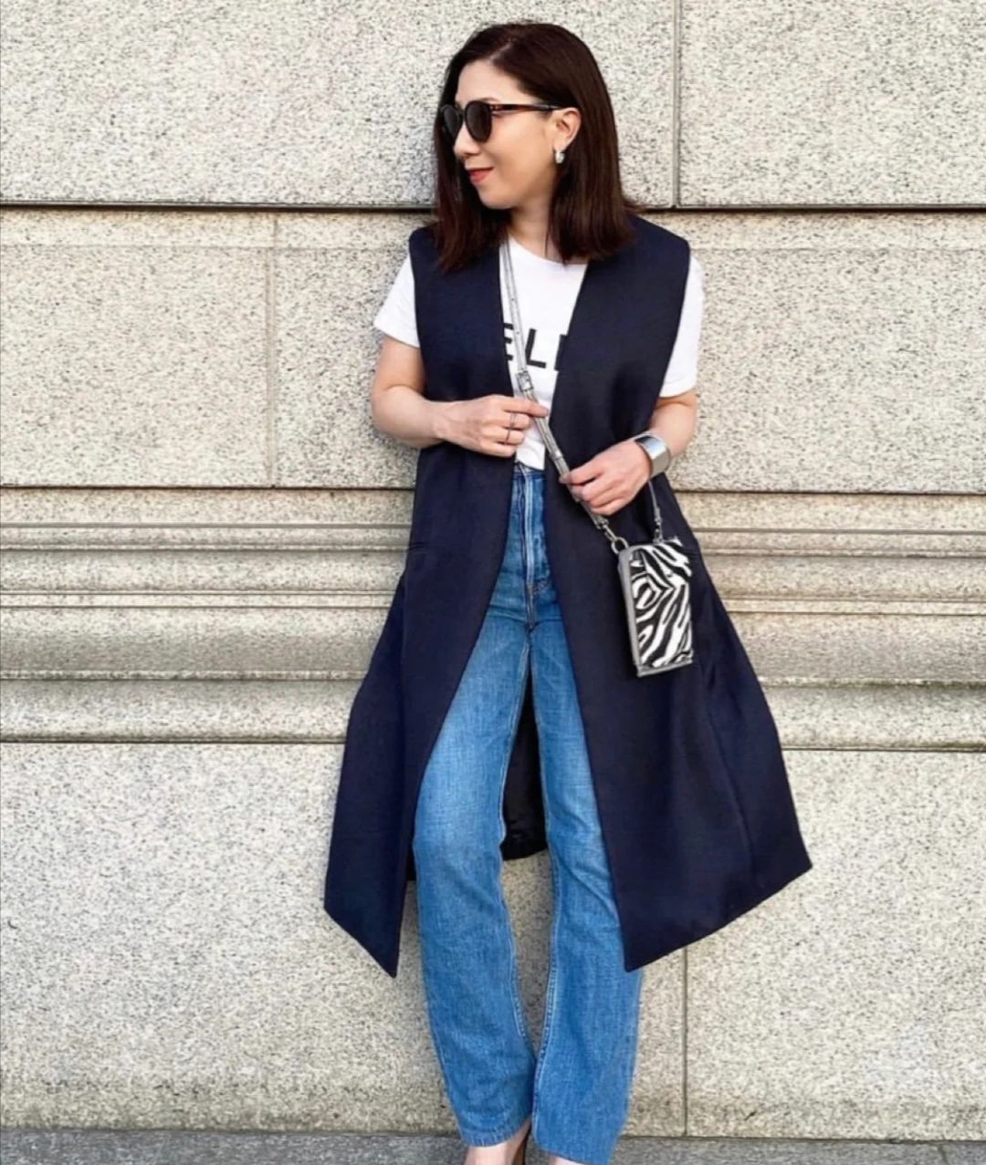 像這件純白色的T恤,它應該是眾多女性都會具備的單品,不管它們的樣貌如何,這類服裝都可以幫助造型盡可能的簡化,讓服裝搭配盡可能的更多樣。疊加一件黑色長馬甲,彰顯拉風灑脫的感覺。