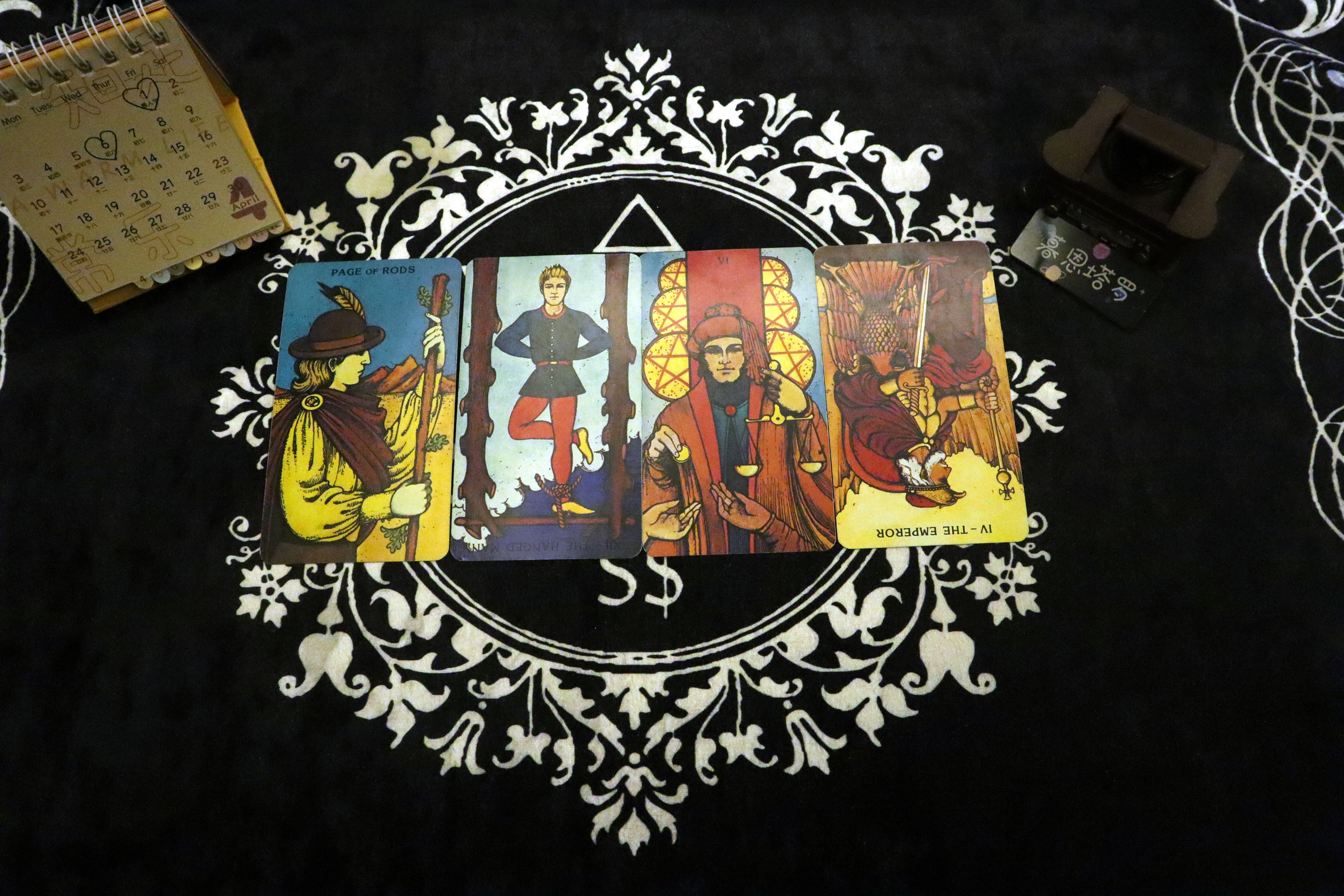 權杖侍從、倒吊人逆位、星幣六、皇帝逆位