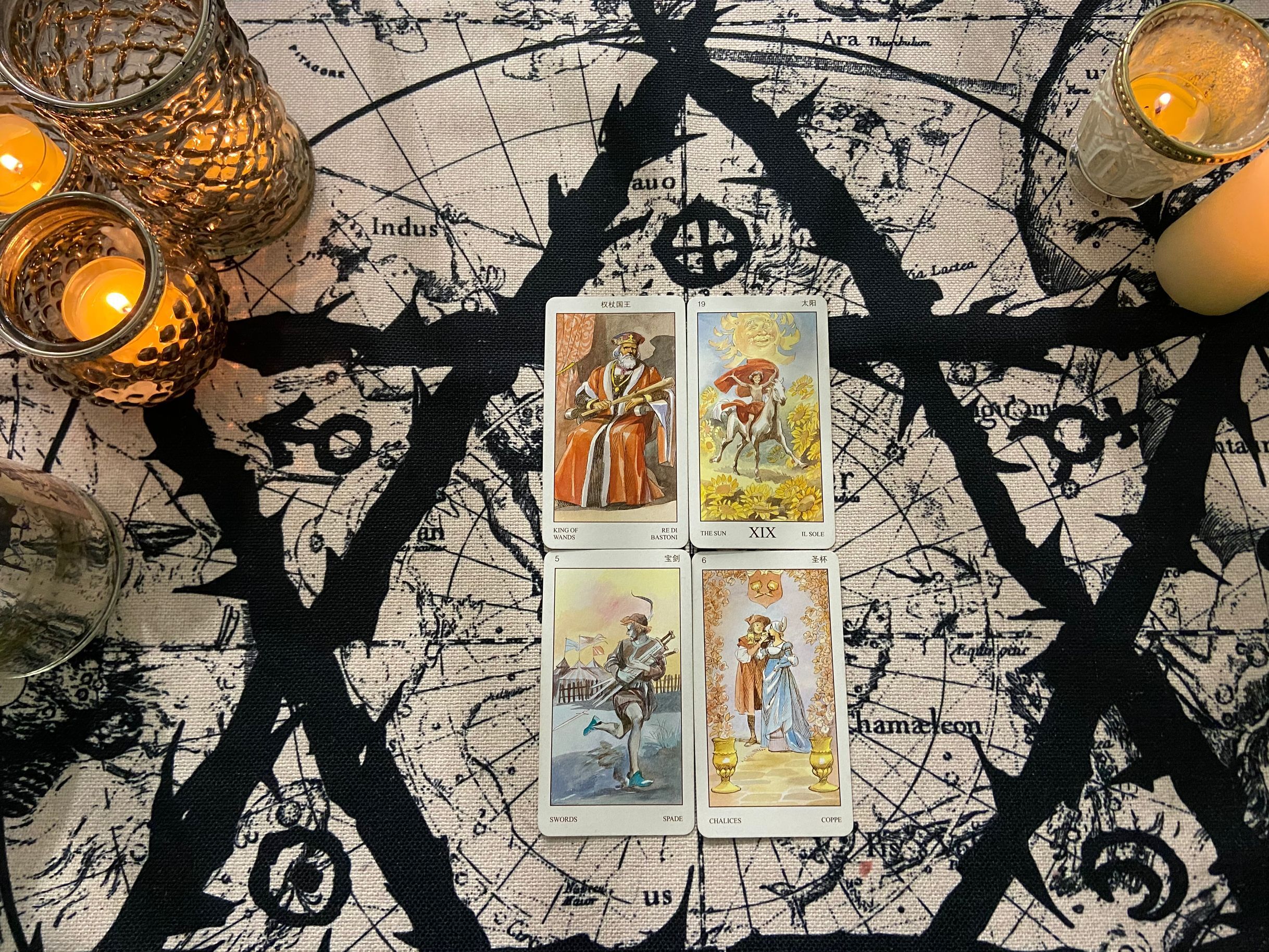權杖國王、太陽、寶劍五、聖杯六