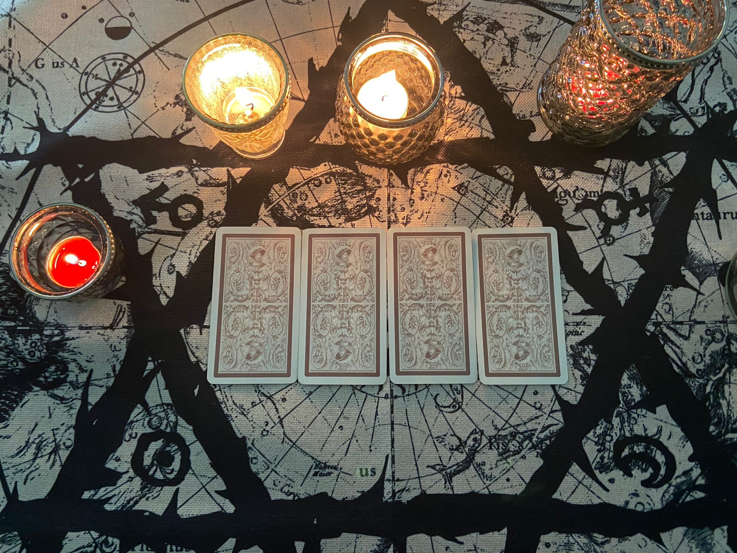 權杖七、魔術師、逆位聖杯七、星幣四