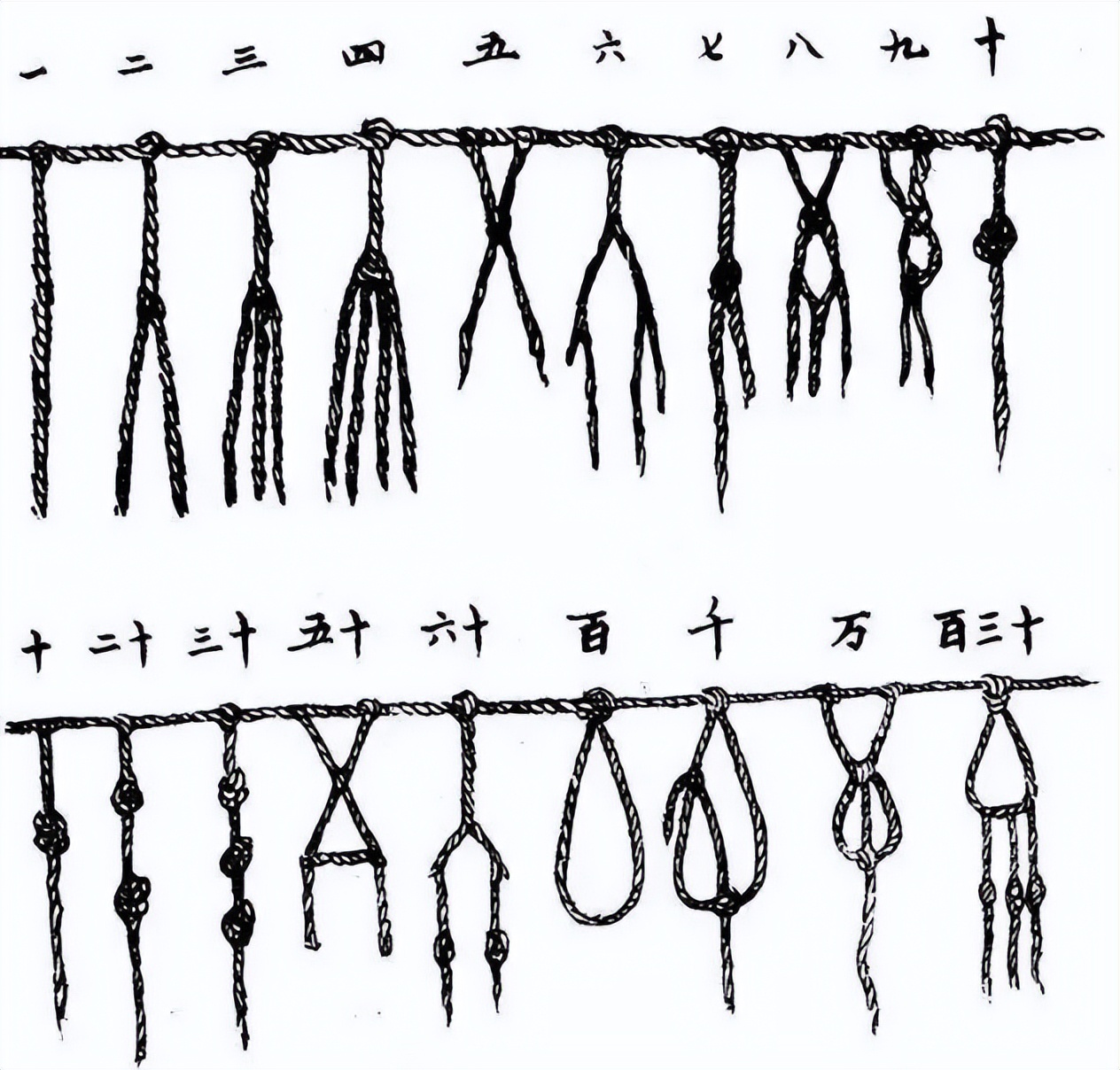早在伏羲時代,人們就會計數,用的是「結繩法」,就是在繩子上打結。今天我欠你一個木梨,你在繩子上打個結,明天再欠一個,你再打個結,月底一算帳,我還欠你一串糖葫蘆。就是說,打結多了容易記混,最多能打八條繩,掛在竹竿上,稱為八掛。