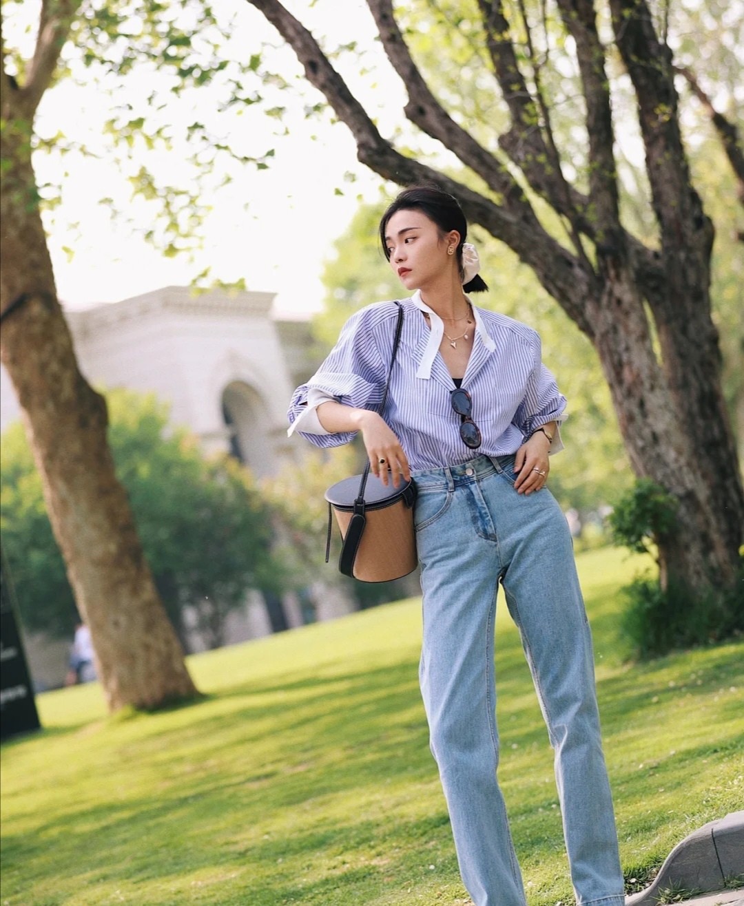 像這件條紋襯衫,將領口拉大,露出來的頸部肌膚多一些,就能讓風格的形成更加的隨性。搭配一條藍色牛仔褲,休閒又隨意。