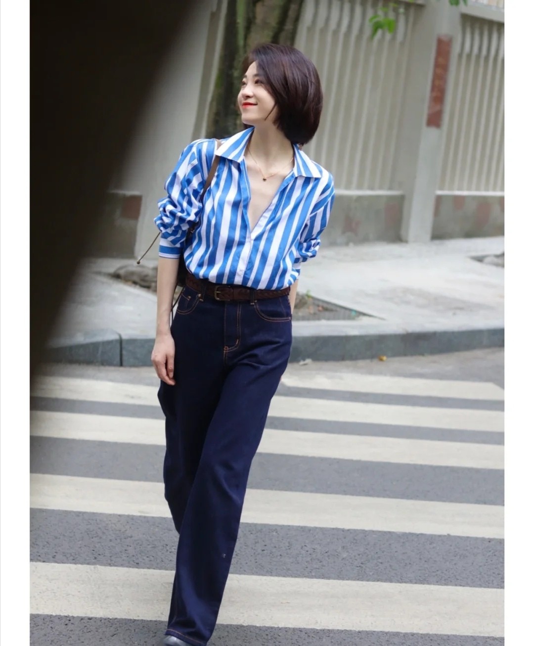 條紋襯衫是女性絕對不會錯過的一款單品,這是因為它對年齡包容,就算是口味不一致的女性,也能找到符合自己眼緣的幾款色彩。相對來說,條紋襯衫營造的拉伸性很顯著,涵蓋的顯瘦效果更突出。