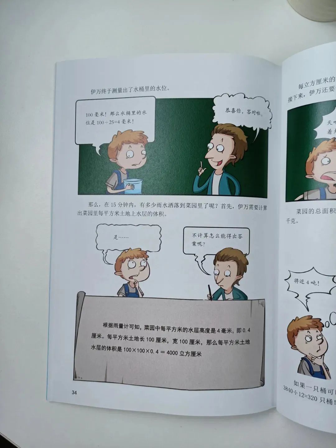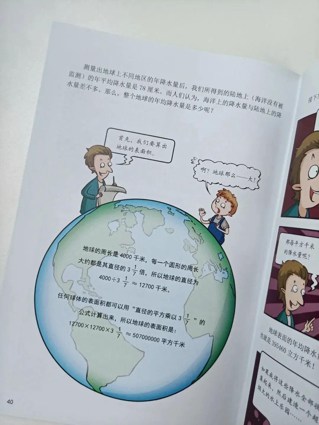 就拿第三冊《魔法數學》中「有多少雨雪」為例,故事內容就涉及到降水量、雨水層高度、菜園裡每平方米地上水層的體積、地球年均降水量等等。