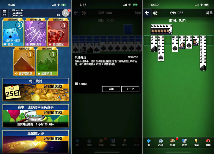 其中包含了以前版本的 Windows 中內置的 Klondike(紙牌)、FreeCell(空當接龍)、Spider(蜘蛛紙牌),以及 Pyramid(金字塔紙牌)和 TriPeaks(遠古紙牌)五種玩法。