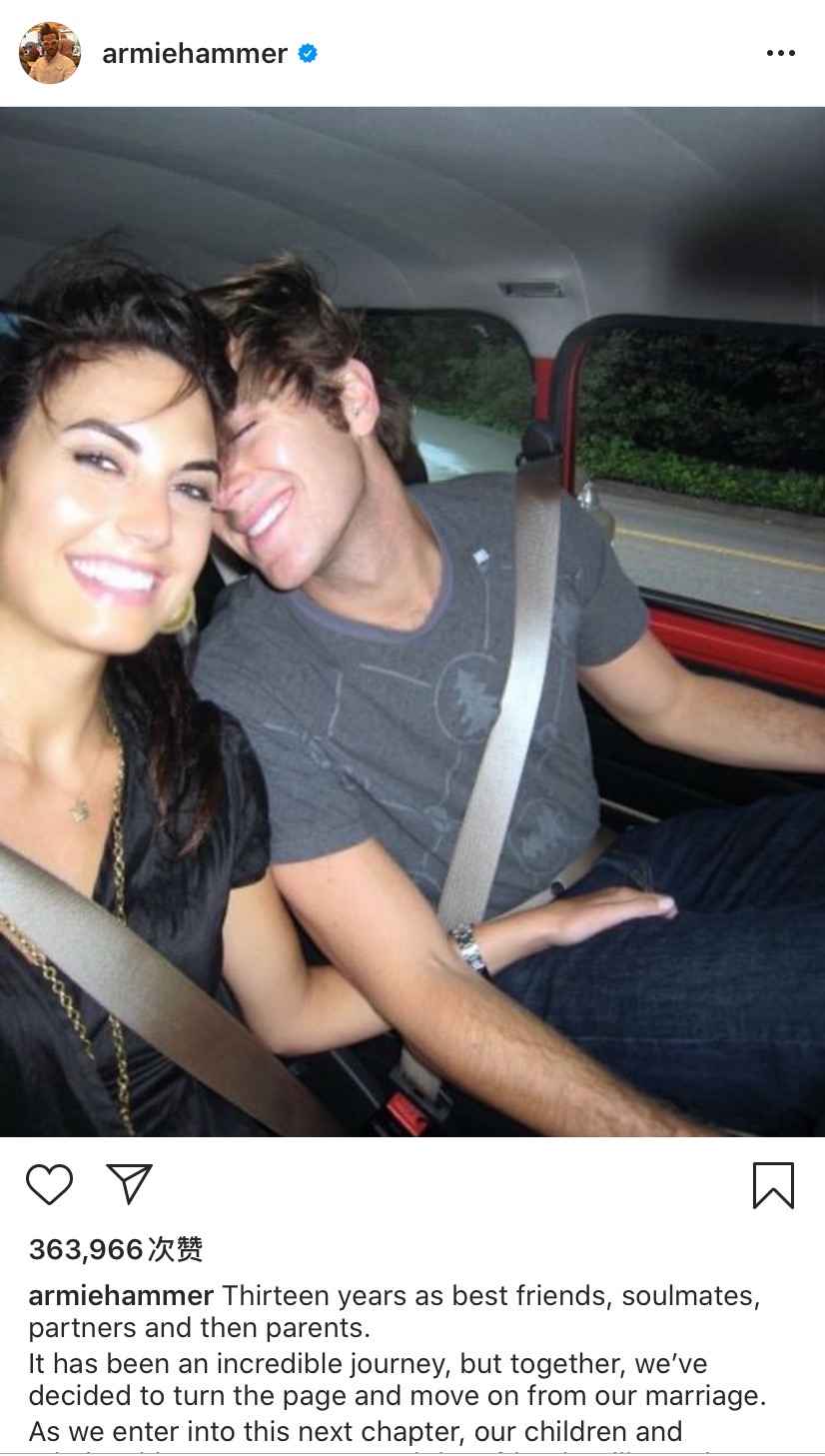 早在七月,艾米·漢莫曾發文宣布與妻子離婚:”十三年的時間裡,我們從最好的朋友、靈魂伴侶、夫妻到父母,這是一段不可思議的旅程,但是我們共同決定翻過這一頁,從婚姻中走出來。”二人常在社交平臺上大秀恩愛,沒想到還是離婚了。