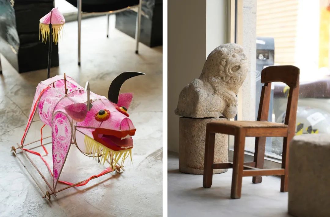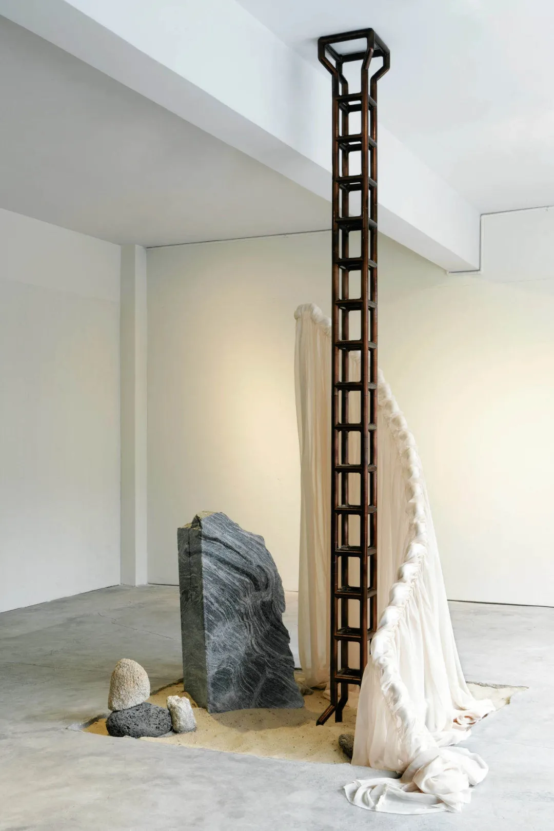 最近,在空間的中心,一場名為「後現代遺址」的展覽上線。由兩張黑色假石桌,一扇沙色屏風和一根頂天立地柱組成。這個設計來自夫妻二人的設計師朋友卜佳新,靈感來自於「對自然的模仿、歷史作品的拼貼和一點幻想」。