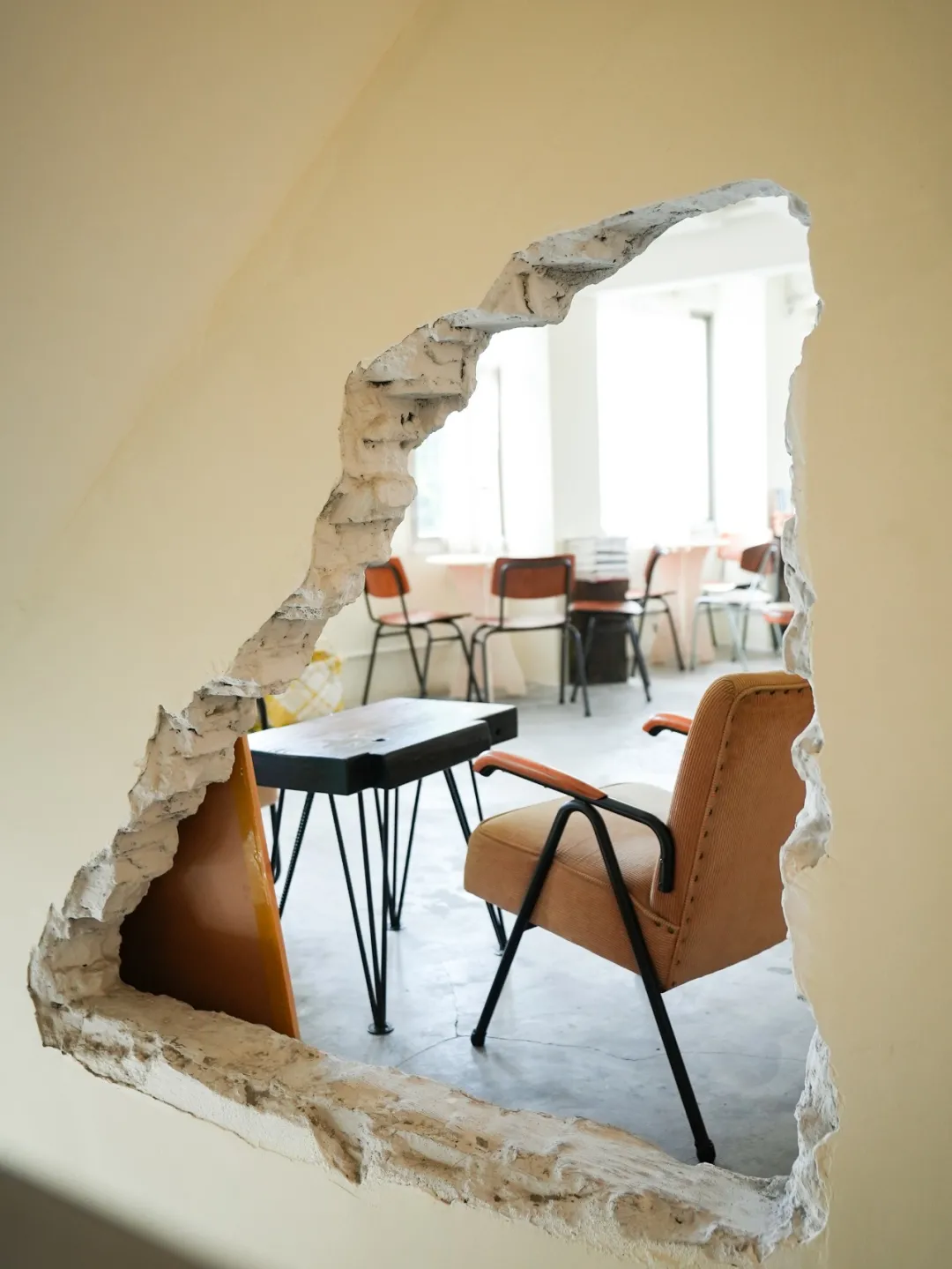 從一樓到二樓的樓梯,牆面上鑿出的兩個不規則的洞是巴浪魚的特色。阿梅解釋說,這個視角,代表了一種人在上樓時的「好奇心」。這個本來是因地制宜的創意,引發了許多咖啡館的模仿。