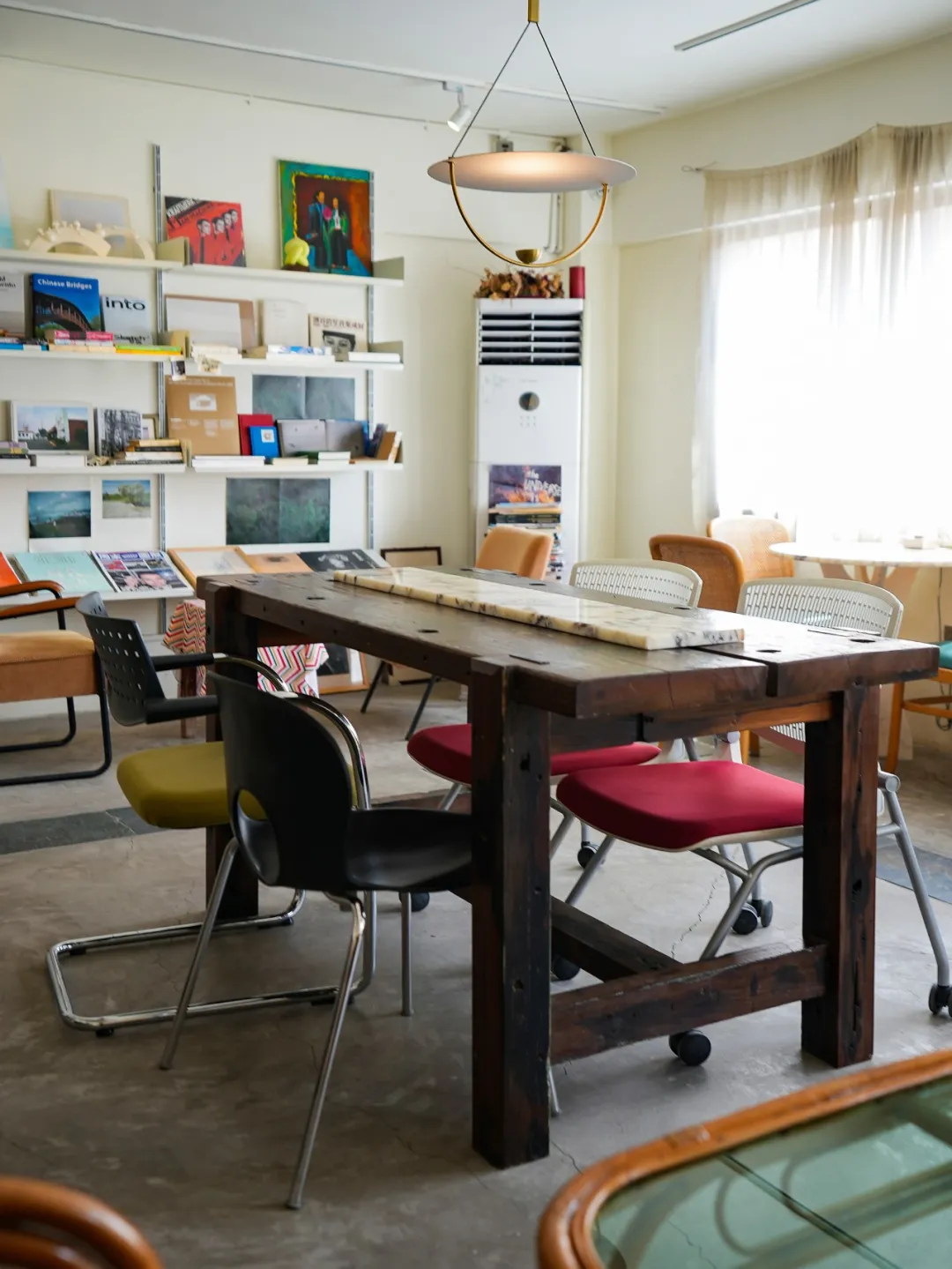 這裡既是服裝買手店、也是小型美術館。時值「赤子」和深圳雅昌藝術圖書館合作,承辦了「器物-家-世界」海上絲綢之路書展,空間的結構被調整過,辟出一方區域,專門陳設了相關的圖書。兩根船木充當了書架的功能。