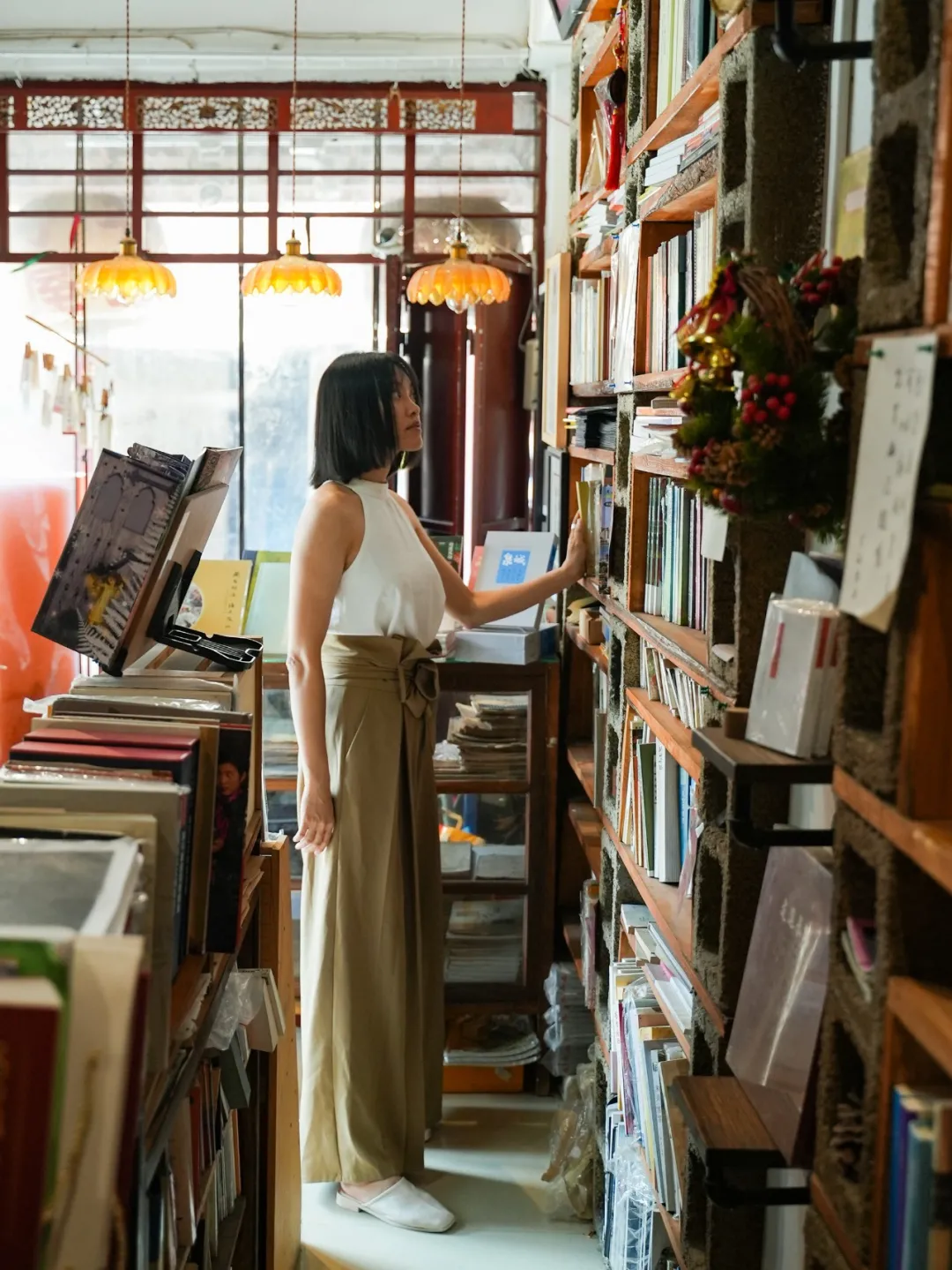 我們在芥子書屋見到了蟲蟲。這個瘦高溫柔的女生開創了文化品牌「美好生活」,旗下有小酒館、沙茶面店、茶館、書店、民宿等等業務,都在不長的西街上,蟲蟲日常穿梭在不同的鋪面裡,得了個「西街一姐」的名號。
