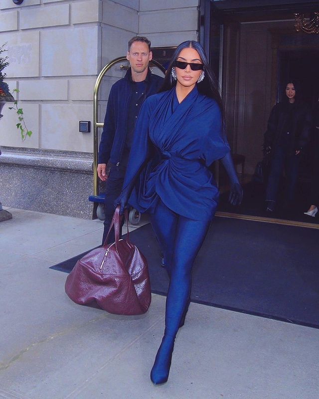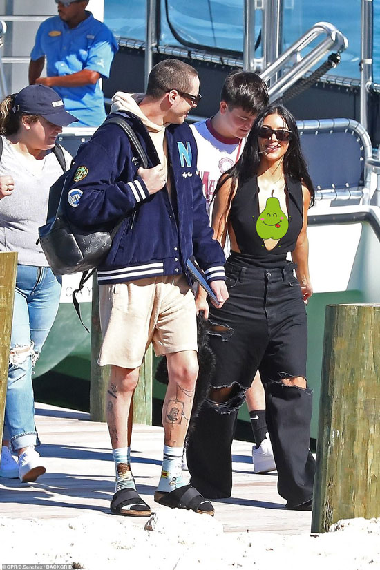 從船上下來後的金看上去也很開心,和彼特有說有笑地走著,兩人似乎都很興奮。金穿了一條破洞牛仔褲,又長又寬的褲腿讓原本就沒有什麼身高優勢的她看上去更加矮,腿部線條在視覺上被縮短了,但顯然腿不是造型的主角,金似乎更願意讓他人(可能主要是彼特)的目光集中在她上半部分的優勢上,這也是她久違的豪放穿搭,這位已經成功躋身億萬富翁行列的女星近一段時間似乎有意想告別曾經的風格,即便是參加Met Gala,也會把自己捂得嚴嚴實實的。