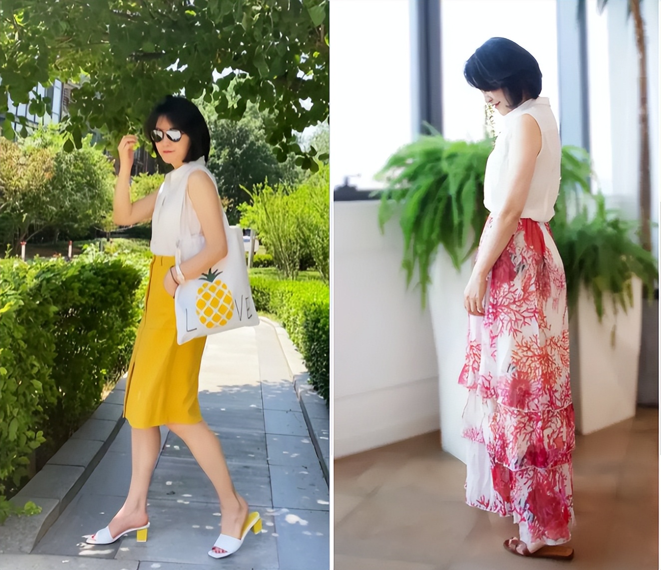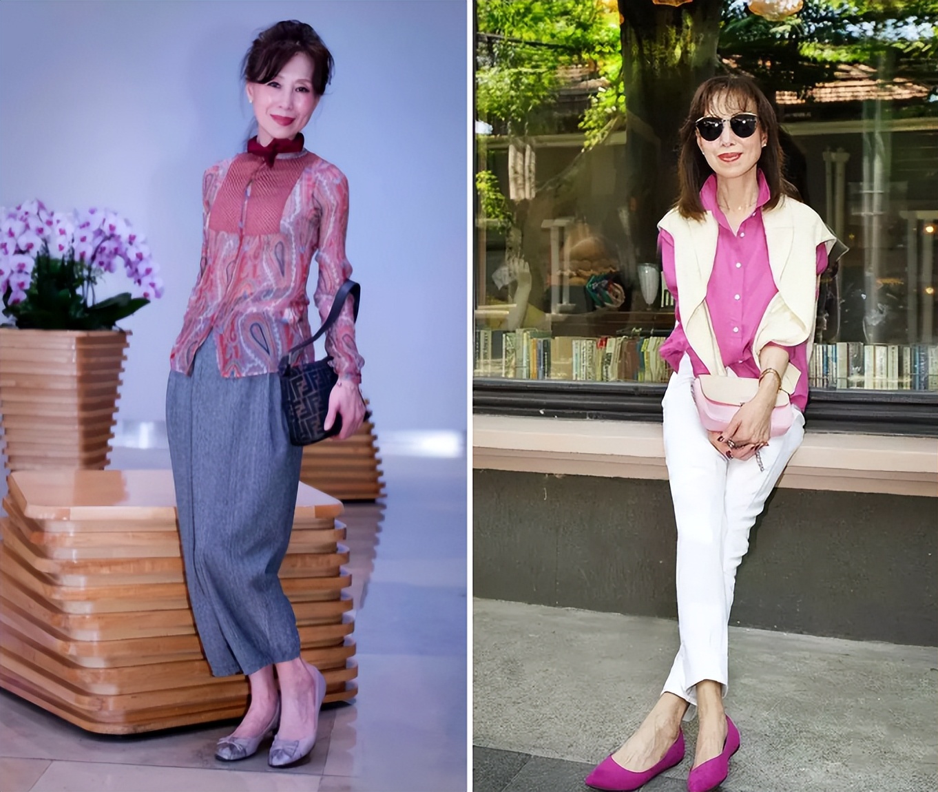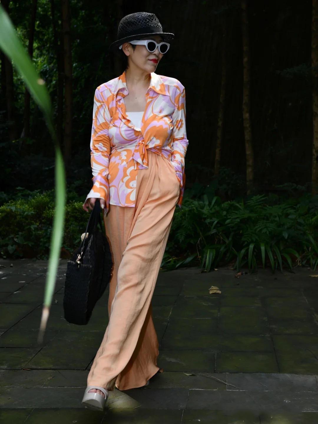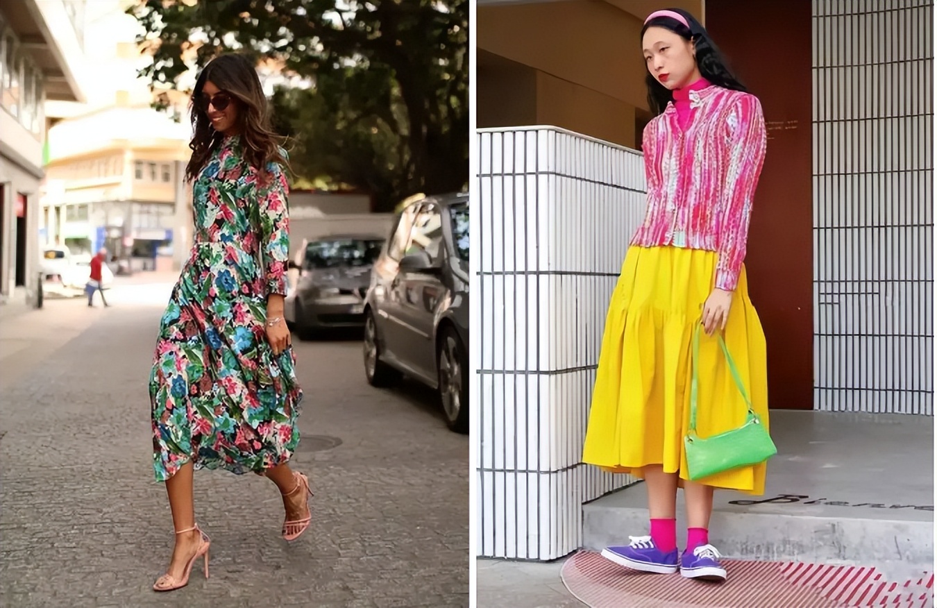 例如這兩身,繁雜又鮮艷的碎花裙、高飽和度的撞色穿搭,視覺上看很凌亂,駕馭難度高一不小心就很容易顯得土氣,且對於中年女性來講,這樣的穿著很容易拉胯氣質。