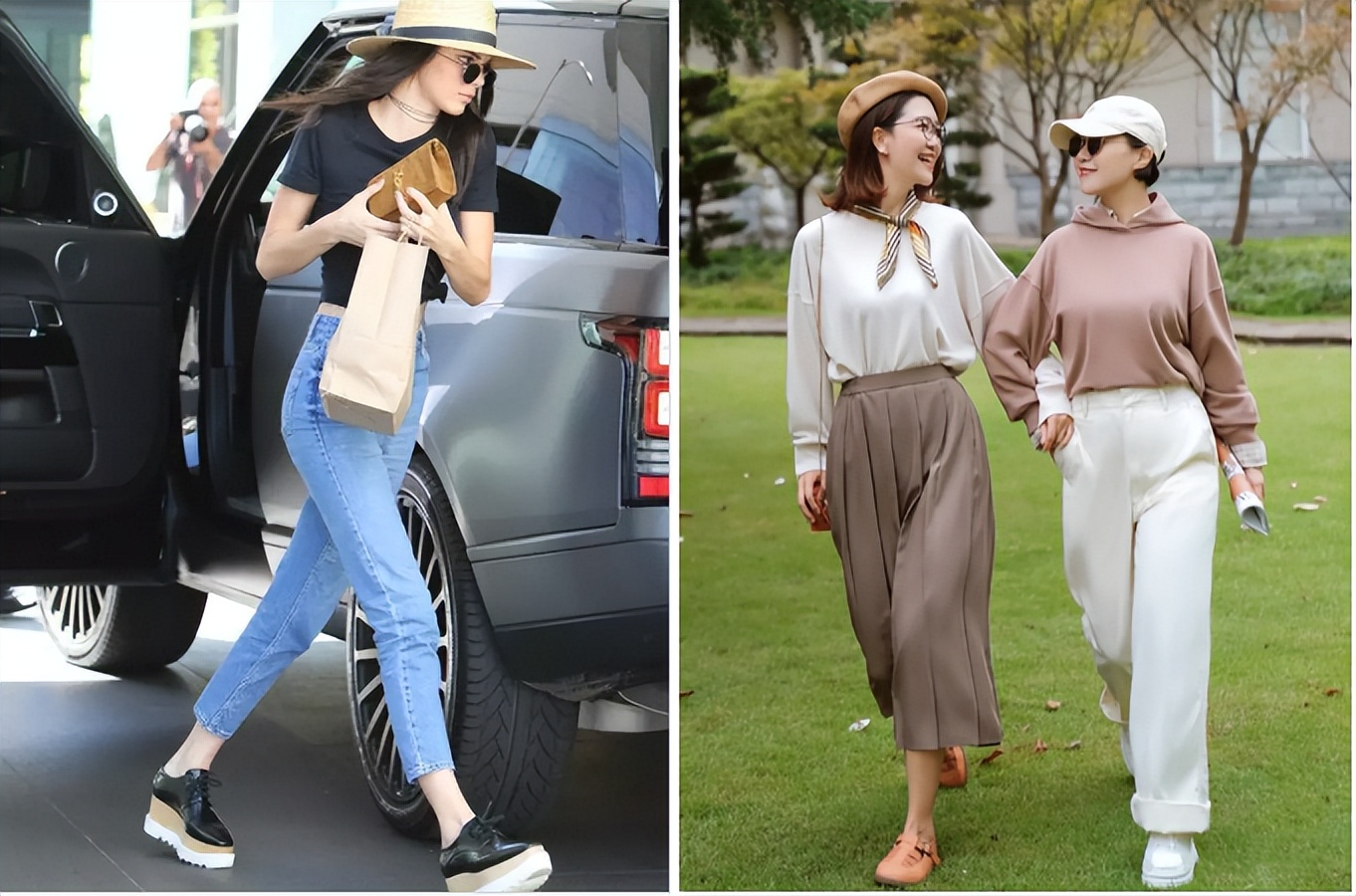 這類鞋子其實對身形的要求比較高,如果你的身形比較纖細、瘦的話要盡量避開這種厚底的鞋子,駕馭不了。看這一組對比,左邊超模的身材駕馭厚底鞋也會顯得有點吃力,而右邊普通的媽媽,身形微胖,反而駕馭得更好。