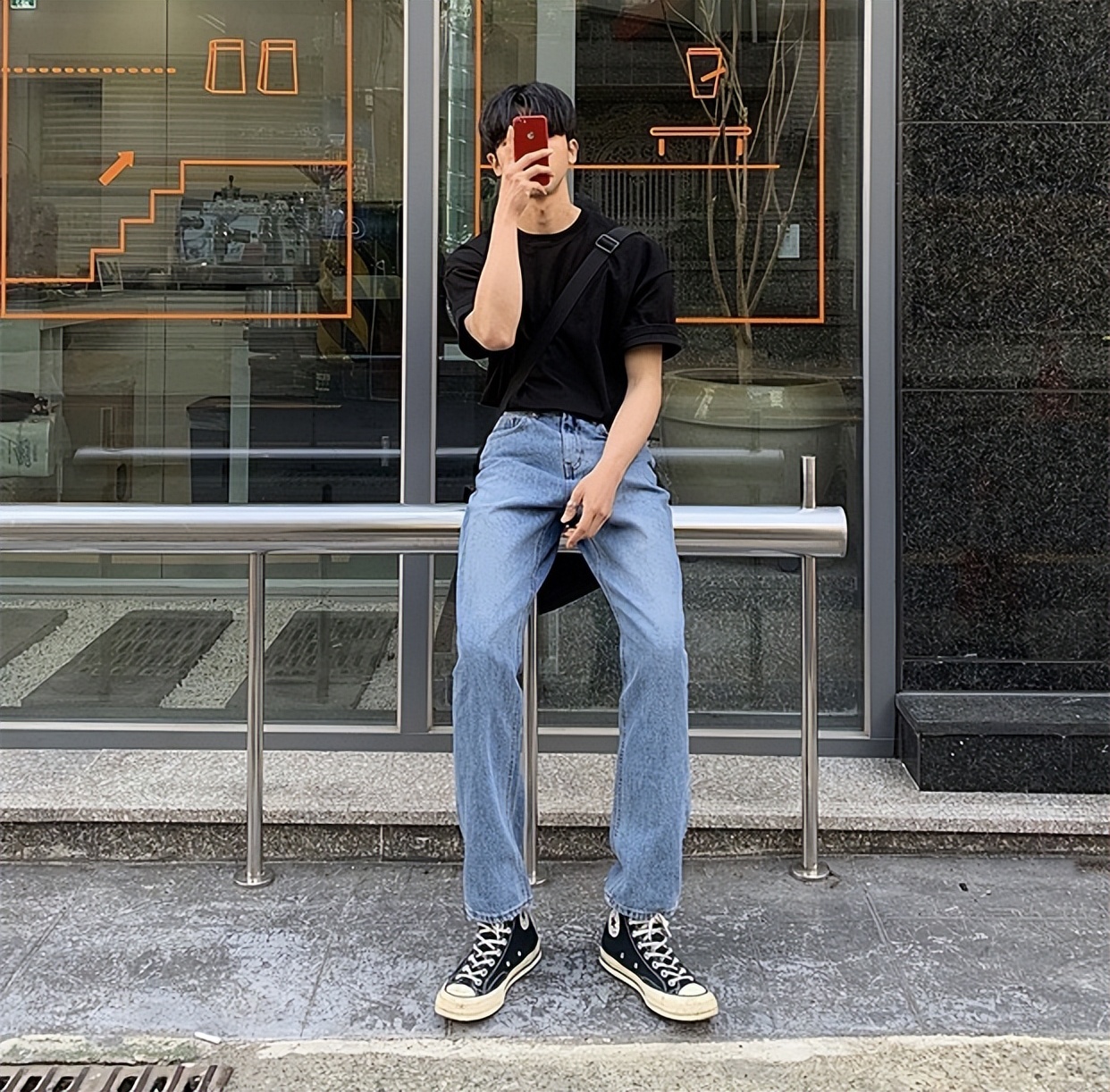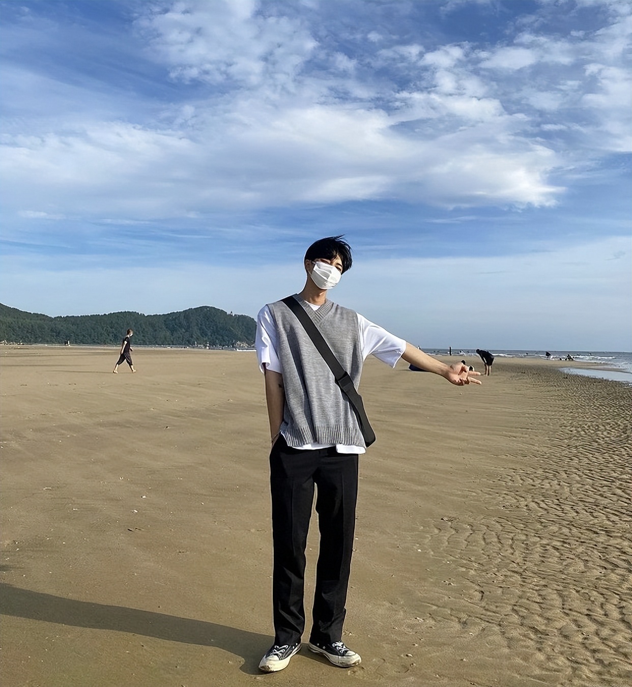 喜歡百搭耐看一些,經典黑白灰組合更加受到男生歡迎。灰色基礎V領針織背心,裡面搭配一件白色的T恤,顏色上層次十足。黑色直筒牛仔褲,加上帆布鞋,舒適又簡約。▼
