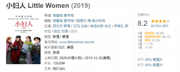奧斯卡提名最佳導演格雷塔·葛偉格改編的這部電影,卡司陣容強大,加上全程高能的劇情,令這個19世紀的女性成長故事煥發出新的光彩,比原著更加適合當代女性。