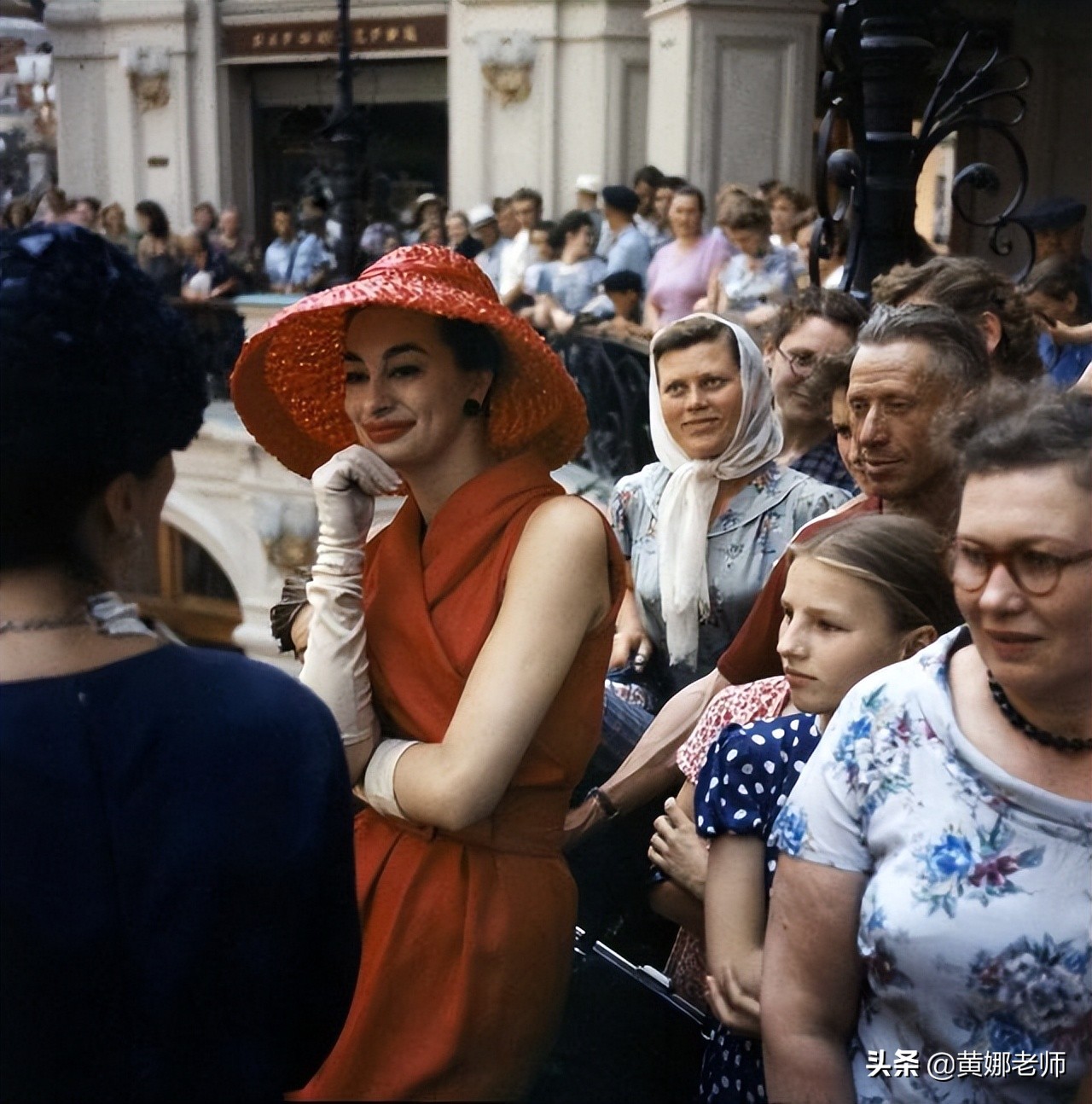 第一次近距離「體驗時尚」的蘇聯人民,跟看猴一樣圍觀….雖然他們的表情各異,有的都不好意思走近了光亮正大地看,但觀眾們的心裡應該都在想——天啊,沒有對比就沒有傷害!