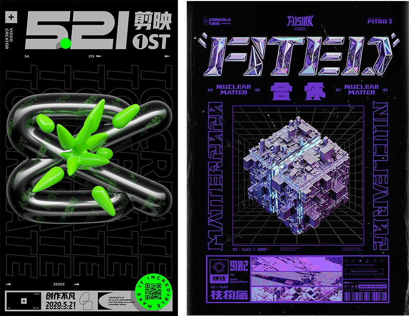 3D的物體、霓虹般絢麗的色彩、金屬字體、液態風格、科技未來感場景等,讓設計作品充滿了像一種「朋克精神」的設計浪潮。