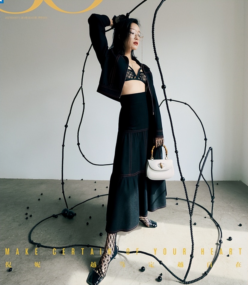 在另一組造型中,倪妮穿著黑色的網格內衣,露出小蠻腰和精緻的鎖骨。外套一件黑色的短裝外套,下身穿著長裙,腳上的網格鞋既是和內衣圖案相呼應,又使得整個造型更加和諧完整。倪妮還戴著一個眼鏡,長條的設計直垂到胸前,超性感。