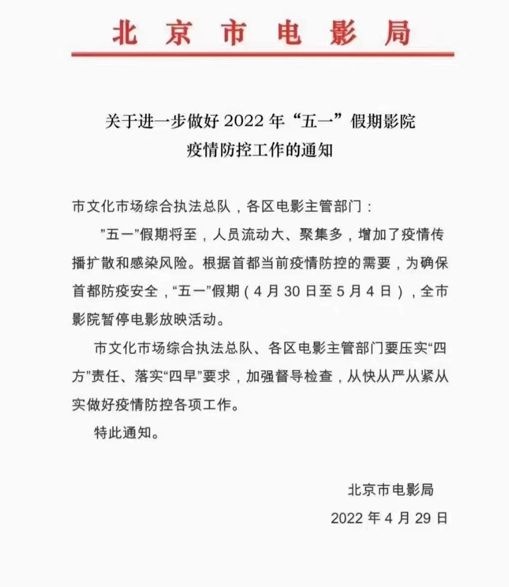 畢竟,防疫形勢嚴格,假期期間的影院經營情況,誰也不好說,但目測不妙,能「搶」出來一部是一部,果不其然,剛回到家,就看到朋友圈的消息,自4月30日到5月4日,整個五一假期,全北京的影院都不予開業。