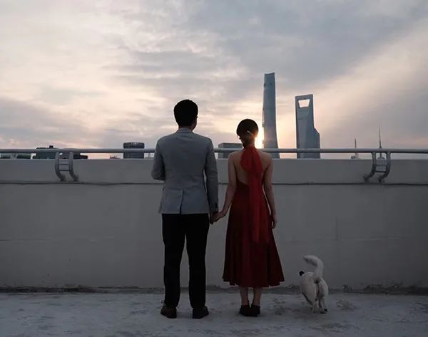 因為疫情,這兩位在上海的年輕人結束了一天的義工工作,脫下裹在身上的防護服,tutti穿上了紅色的禮服,米周一身灰色西裝,二人在天臺上迎著陸家嘴落日的晚霞,手牽著手望著遠方,拍下了一張照片,就算為自己舉行一場簡單的婚禮。