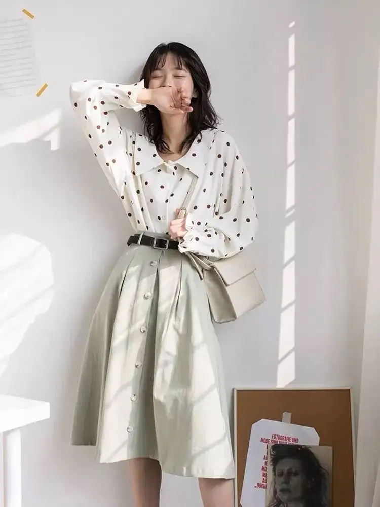 硬朗的襯衫會將整體的風格趨於中性風,如果想要更柔美有女生味,那麼就試試襯衫搭配半身裙的穿法,白色的波點襯衫多了一份俏皮感,木耳邊的袖口也能凸顯女性魅力,下半身搭配一條A字裙,清涼舒適的同時也能遮肉顯瘦,通過腰帶來勾勒出腰線,小個子這樣穿顯高效果更出色。