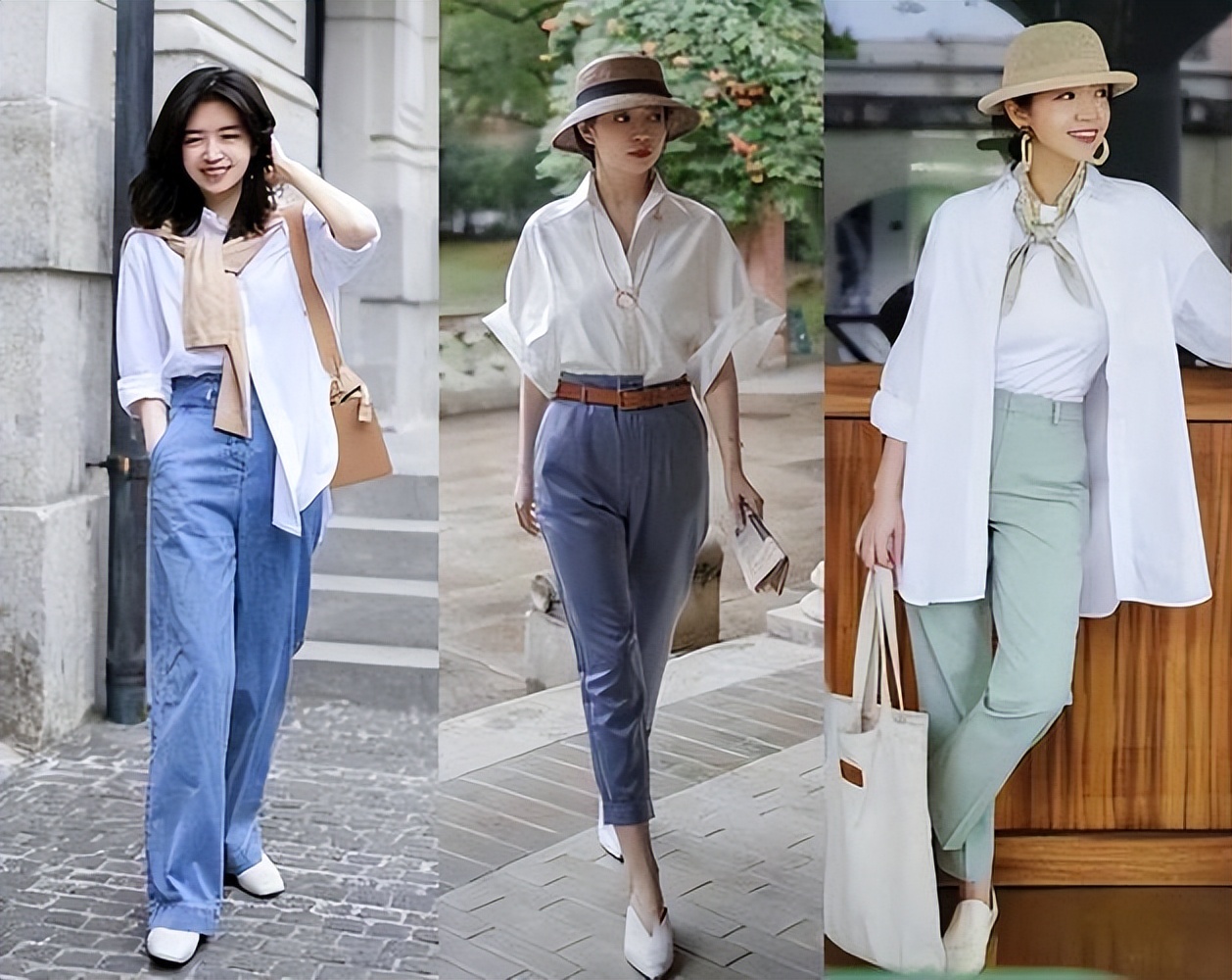 藍色的襯衫搭配白色的闊腿褲,給人一種很清爽乾淨、簡潔耐看的感覺,無需多餘的修飾和點綴,利落的造型也能很好的凸顯女性的氣質與魅力。