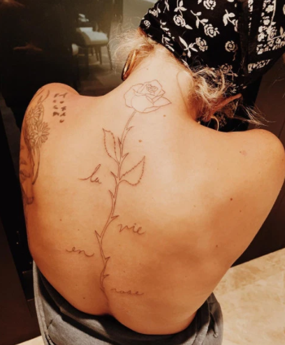 隨後在2月14日的情人節,Gaga在背上紋了一個全新的玫瑰紋身。並在社交媒體上向她的粉絲們大方展示了這款占據了她整個脊椎的新紋身圖案,以此向她在熱門電影《一個明星的誕生》中演唱的法國名曲《玫瑰人生》致敬。並寫道:「情人節快樂。我現在是一朵烈焰玫瑰了。」