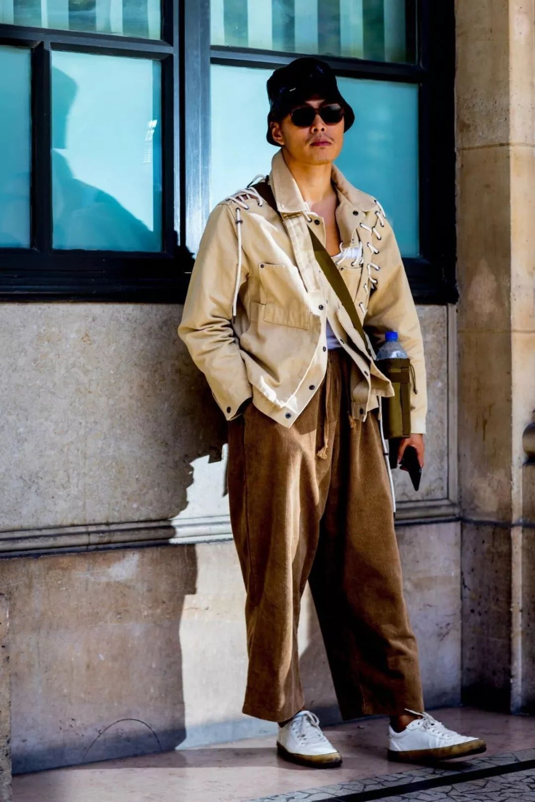 一般來說,燈芯絨闊腿褲的顏色都偏大地色系,所以在搭配上要注意色彩的運用。上衣選擇一件卡其色夾克,同色系但不同明度的兩件單品組合在一起,視覺上能起到延伸效果,顯高又顯瘦。