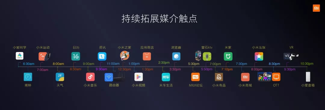 鄭子拓介紹,在MIUI 18個月活超過5000萬的原生App基礎之上,小米之家、小米有品、小米商城等新零售創新序言;語音助理小愛同學、米車生活、小米互娛等互聯網服務創新序言;小愛音箱、VR眼鏡、路由器等智能硬件創新序言;被投企業例如占據超50%高端ktv市場的雷石等創新序言的加入,讓小米營銷可以持續全面覆蓋用戶從早到晚的生活。