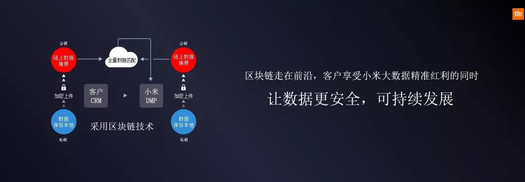 舉個例子,小米營銷「橋計劃」中區塊鏈技術的應用。「橋計劃」是將品牌客戶CRM和小米DMP數據打通,形成用戶回流,從而大幅提升營銷效率的舉措,在橋計劃的加持下,開屏平均CTR提升高達50%-70%。區塊鏈加密技術介入之後,雙方每次數據匹配都將在加密狀態下進行,效率不變的情況下,維護了數據的安全性。