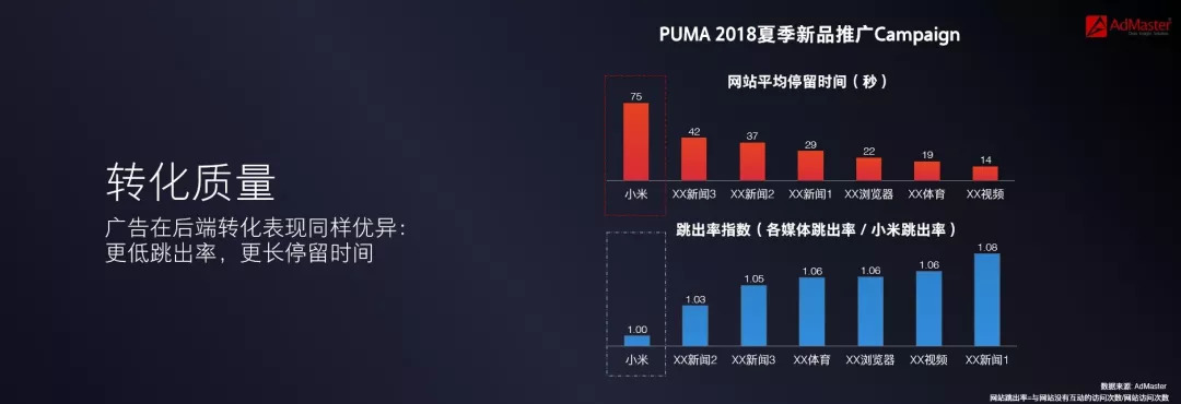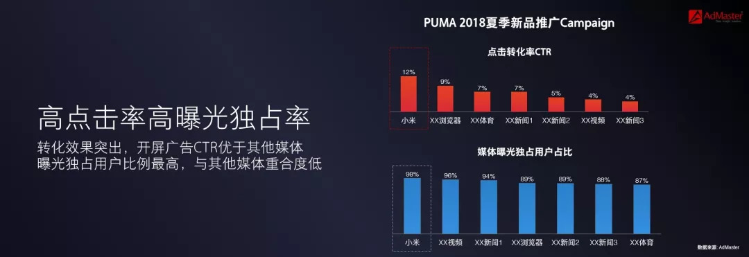 陳傳洽舉例「小米營銷X PUMA」開屏聯投監測數據,來說明小米移動廣告高轉化效果、高用戶獨占、高轉化質量、高品牌收益,四大優勢。小米移動開屏廣告CTR優於其他媒體,且轉化質量高,廣告擁有更低跳出率,更長停留時間。帶給品牌更高收益,有效提升推廣品牌的知名度、品牌喜愛度以及購買意願。