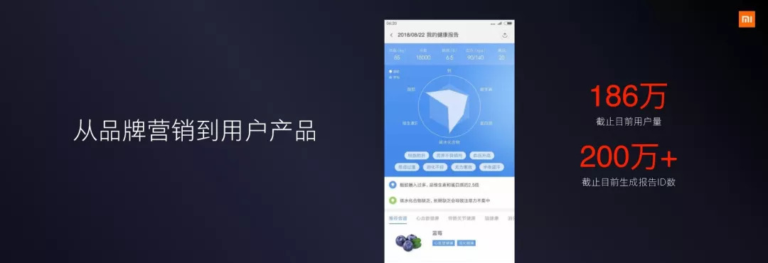 消費者只要輸入每日膳食攝入,通過小米體脂秤、手環和血壓儀等智能穿戴設備,自動導入體重、血壓、睡眠、運動等數據,就可得到針對個人健康需求的「六維營養報告」,及膳食營養建議。