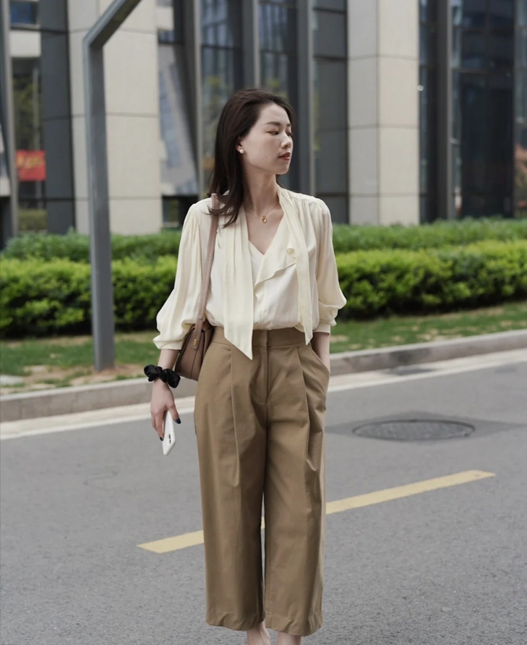 像這件襯衫,它也屬於純色,而且色彩帶來的親和力會更強一些,這種色調可以彌漫出一股子溫柔的風采,搭配的褲裝則較為休閒,可以呈現出很自然、很生活化的穿搭。褲裝寬一點,可以採取九分褲或者是八分褲露出腳踝,舒適又簡單。