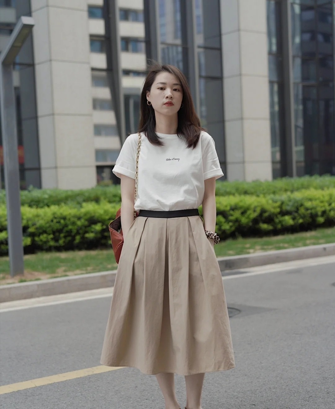 這條白色T恤結合的是一條卡其色過膝裙,如果從顏色方面來說,這兩類色彩的碰撞既大氣又溫和,既簡約又不挑人。裙裝具備腰帶進行固定,可以進一步修飾身段。