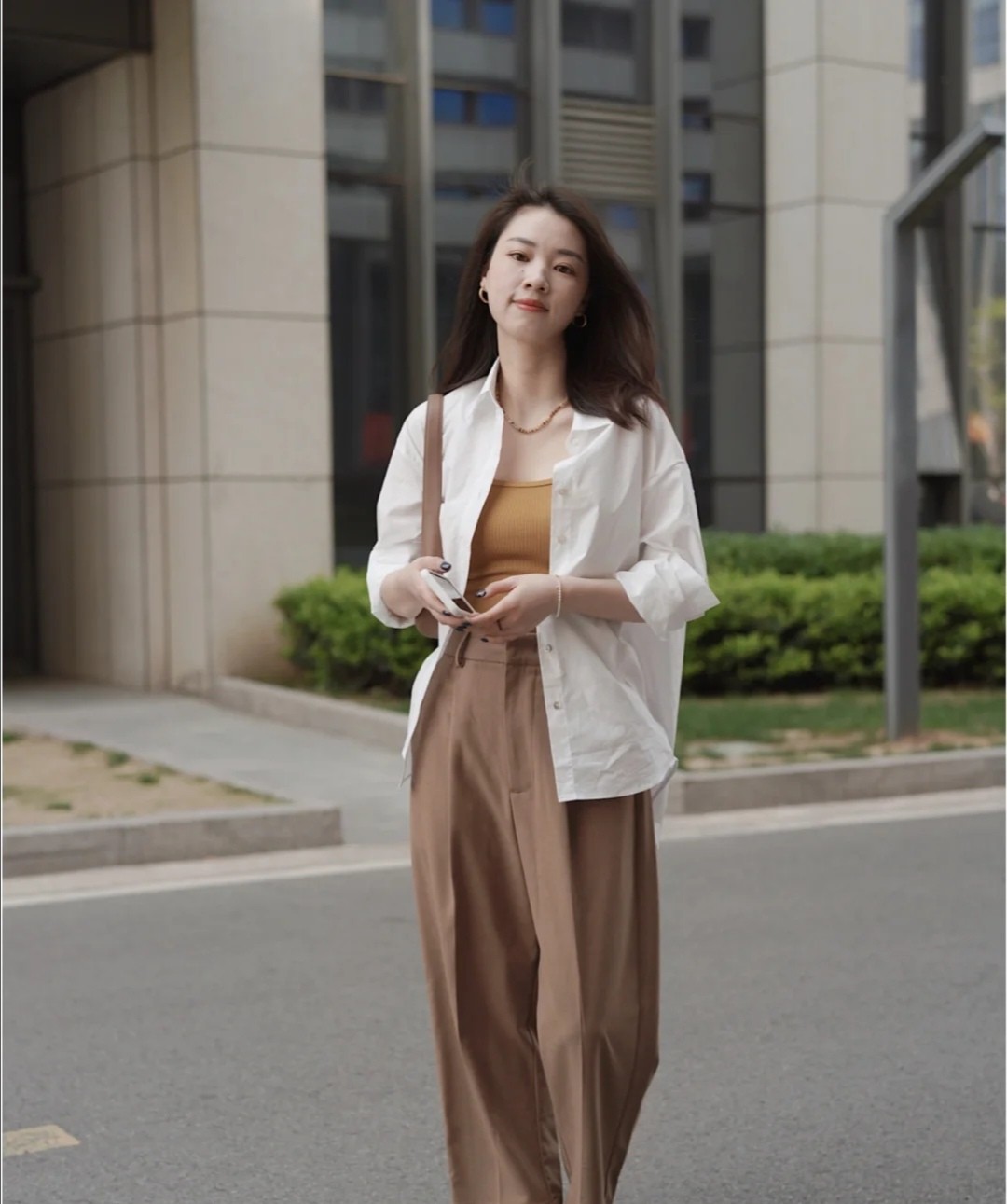例如這件純白色的襯衫,將它作為外套使用,可以在裡面搭配一條背心。背心可以勾勒出體型的凹凸感,尤其是附著在曲線之上,就能構造出一種外松內緊的穿衣方式,但整體不會呈現出過多對肌膚的暴露,也適合那些穿衣風格保守的女性。