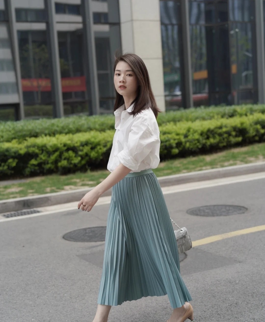 像這件純白色的襯衫,它能夠被女性駕馭出優雅的風格,原因在於下半身疊加的是一條過膝半裙,顏色的選用也很有特色,能形成一種清爽的氣氛和律動感。過膝的長度,幫助不夠纖細的腿型得到遮掩,也可以演繹出十分飄逸的風格,知性而美好。