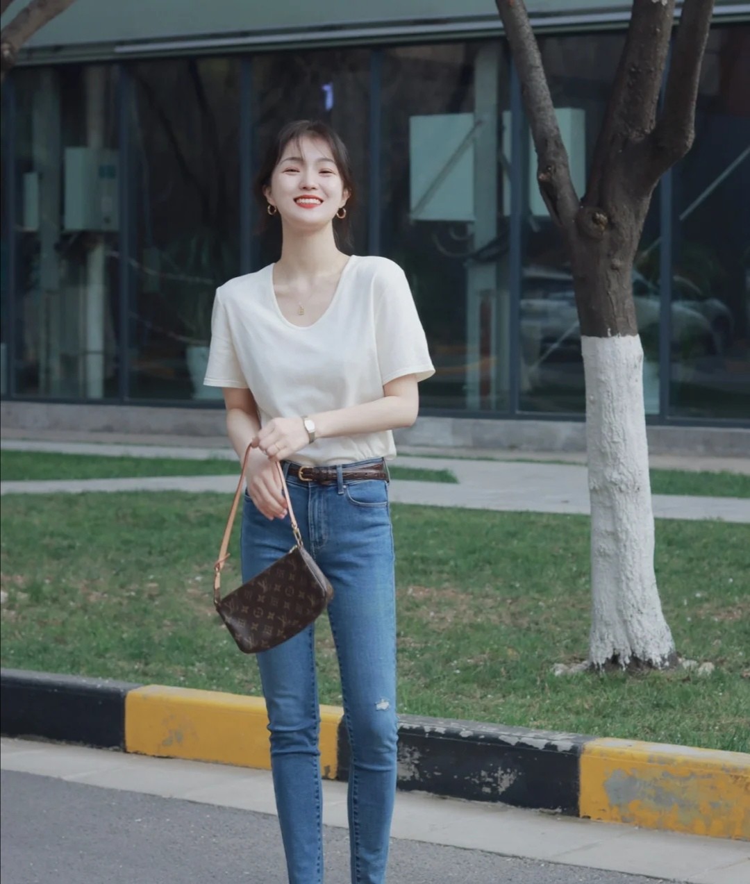 在袖子的設計上不需要太緊繃,也不要太短小,可以採取寬鬆一點的袖子,營造出更加舒服的穿搭。像這件白色T恤,它有著最具包容性的色彩,簡單的配一條藍色牛仔褲,清爽的風格信手拈來,減齡的效果也格外突出。