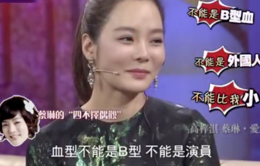她定了四個擇偶條款,說老公不能是外國人,不能比她小,不能是演員,不能是B型。