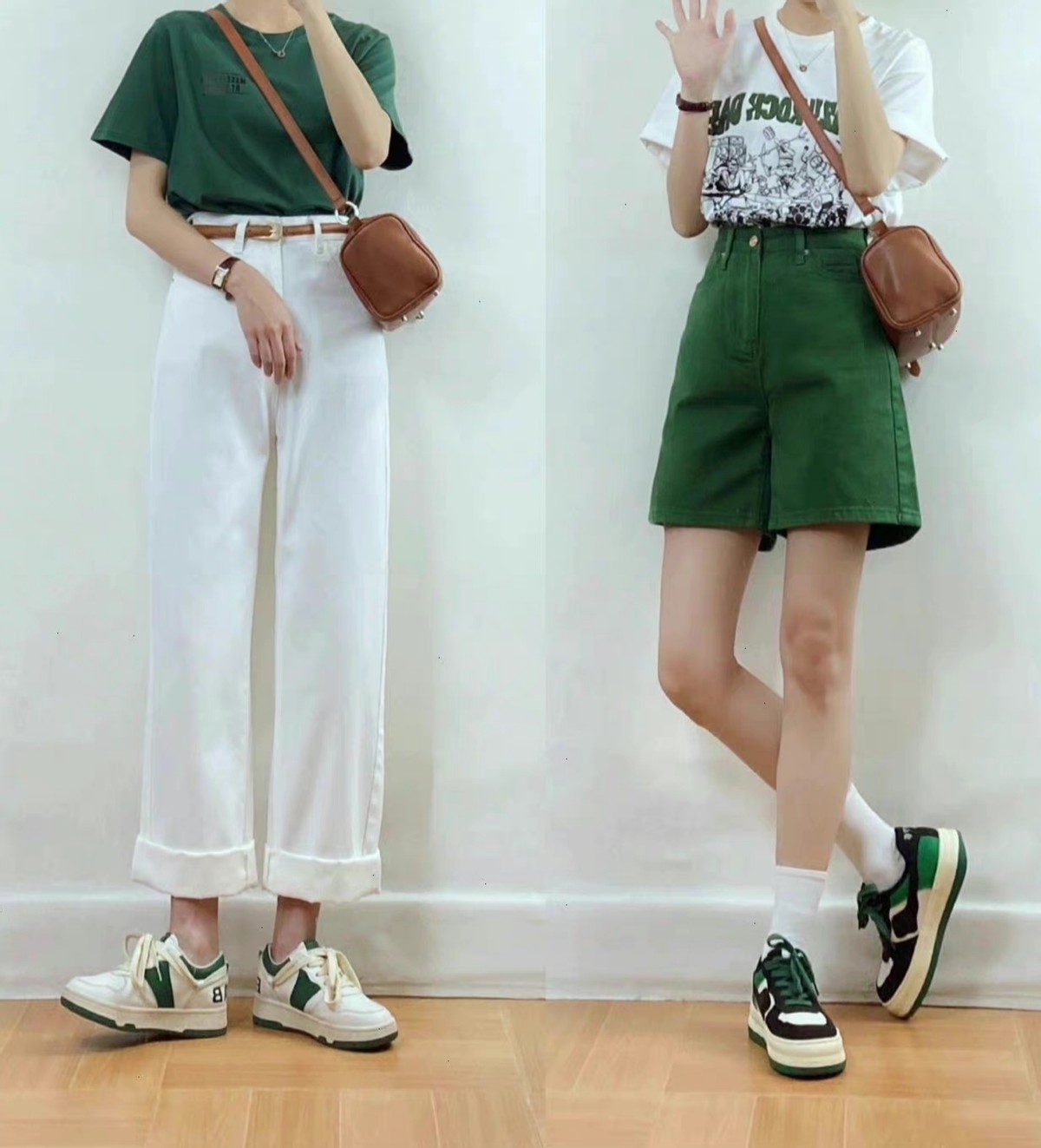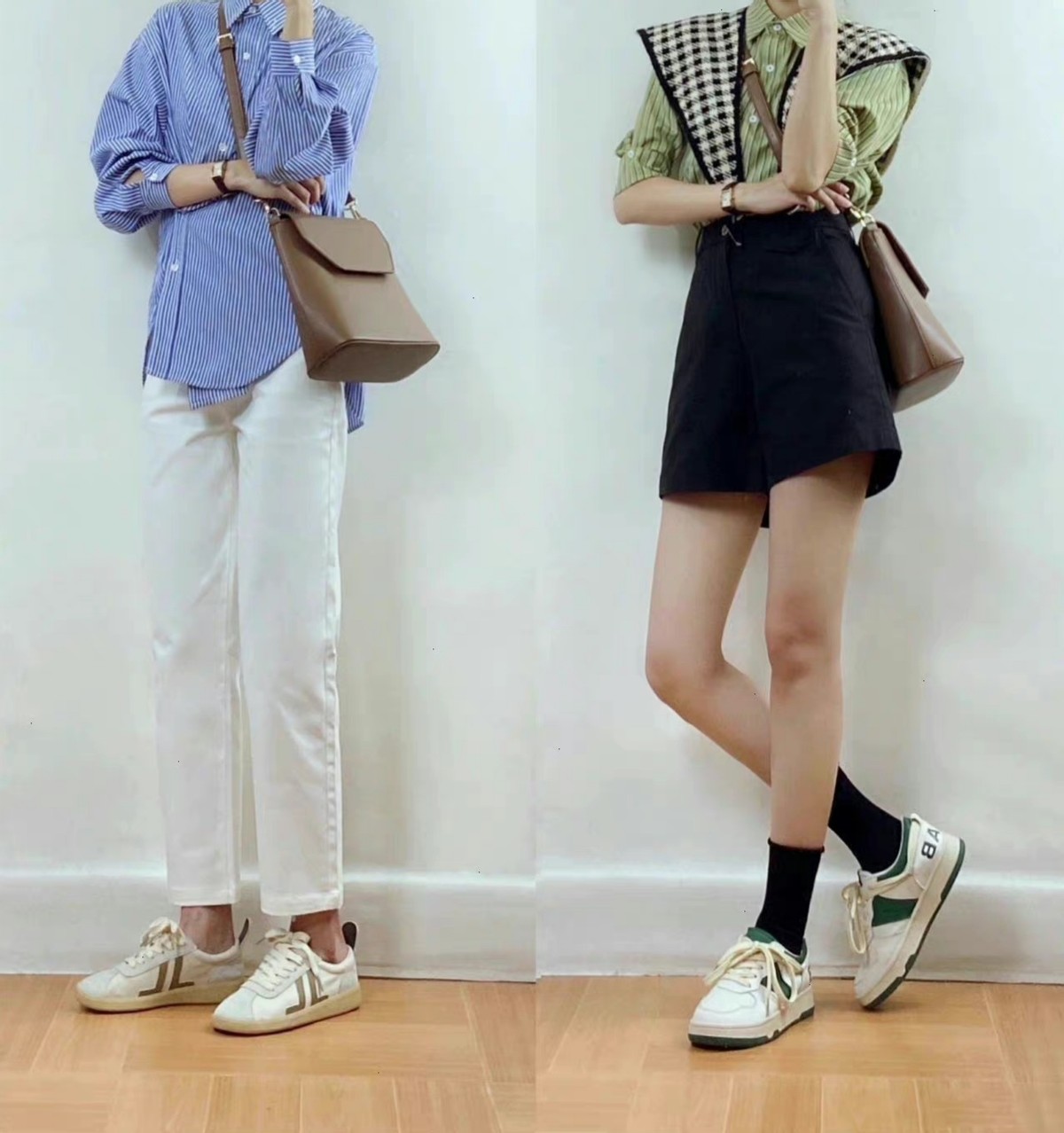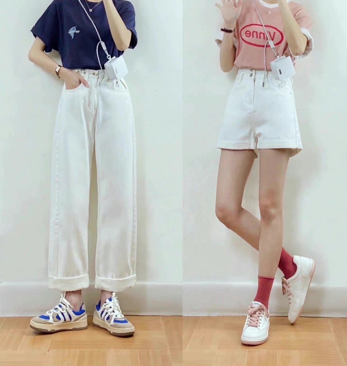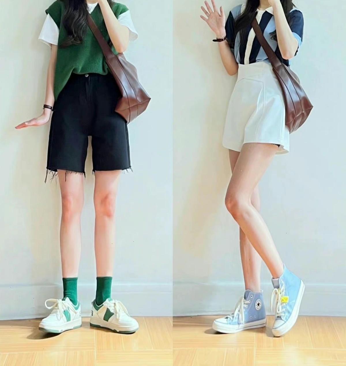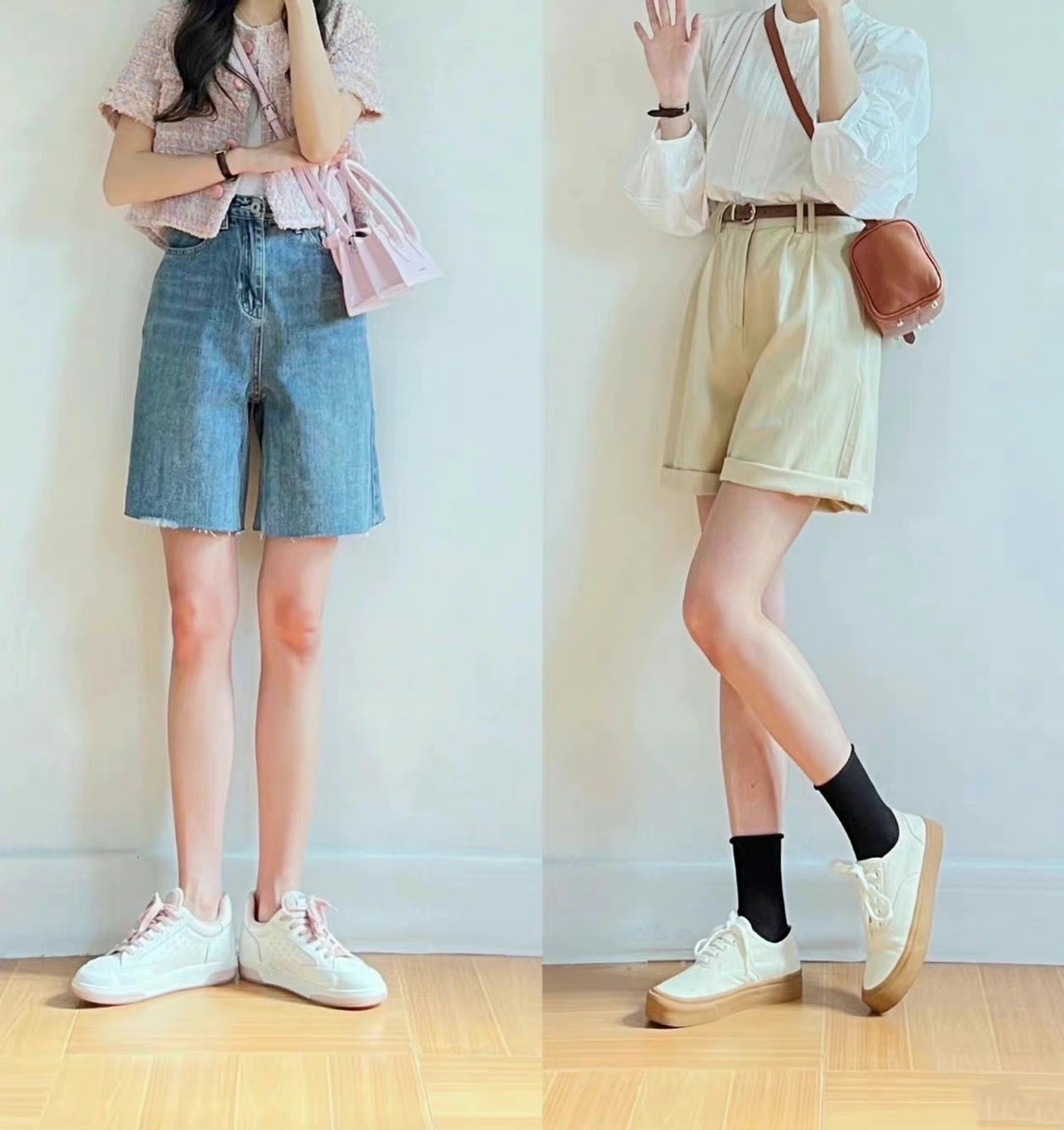 這兩條短褲的顏色選用很日常,藍色看起來更加清新,卡其色帶來的大方感更足。可以運用短一些的上衣與之結合,把腰線襯托出來,才能更加顯高。